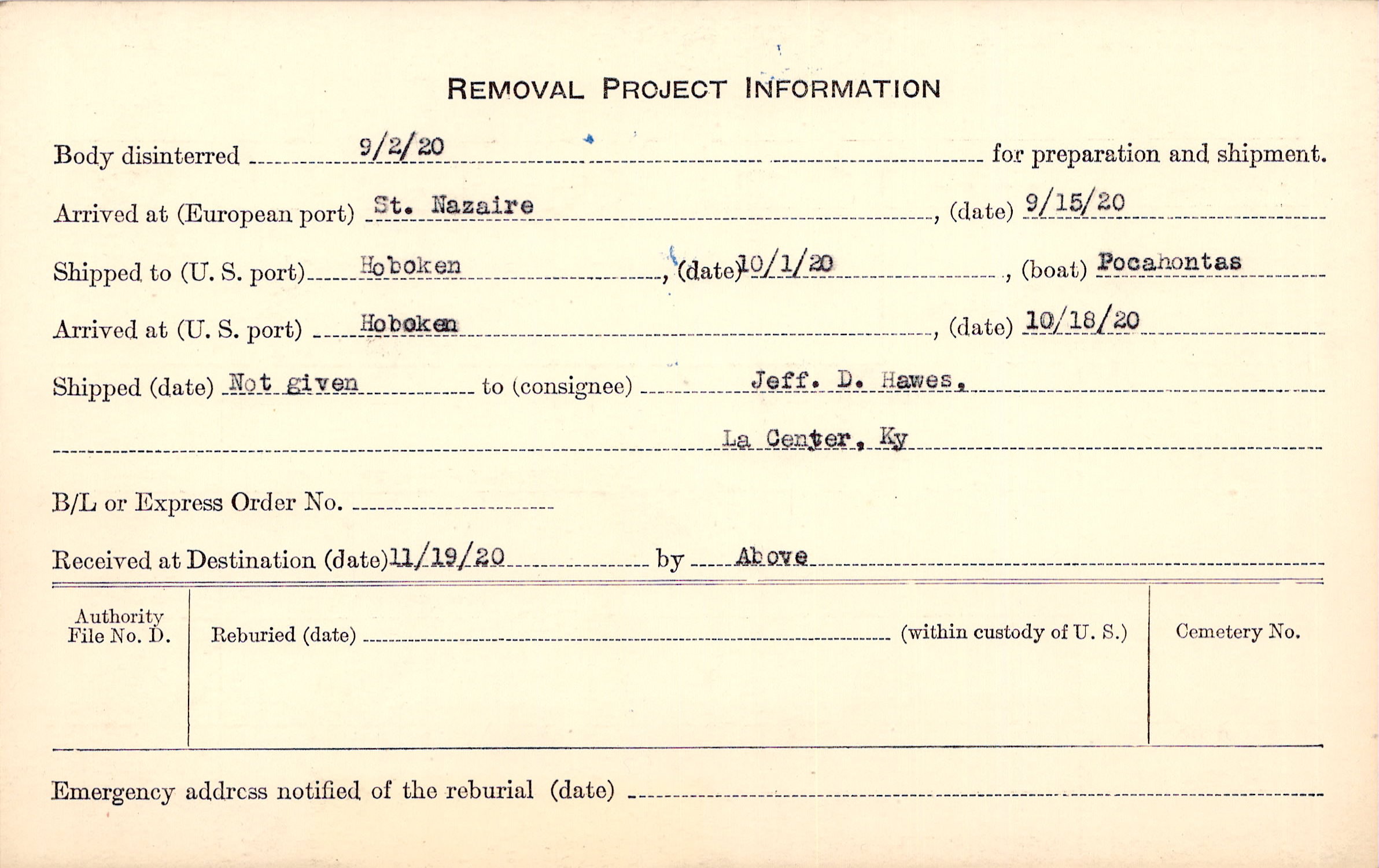 Body disinterred 9/2/1920 for preparation and shipment.