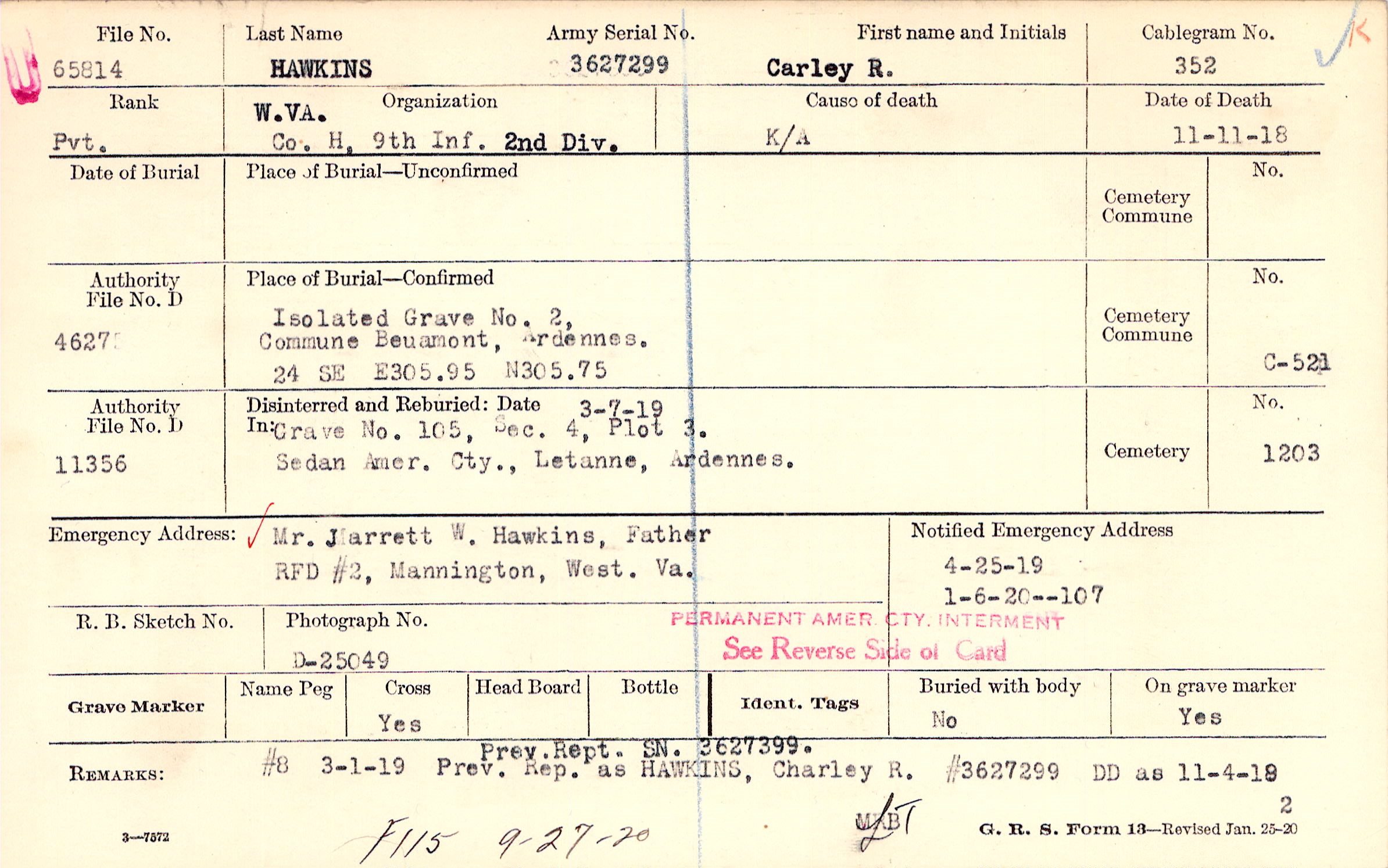 Prev. Rept. SN. 3627399. Prev. Rep. as HAWKINS, Charley R #3627299 DD as 11-4-19, #8 3-1-19, F115 9-27-20