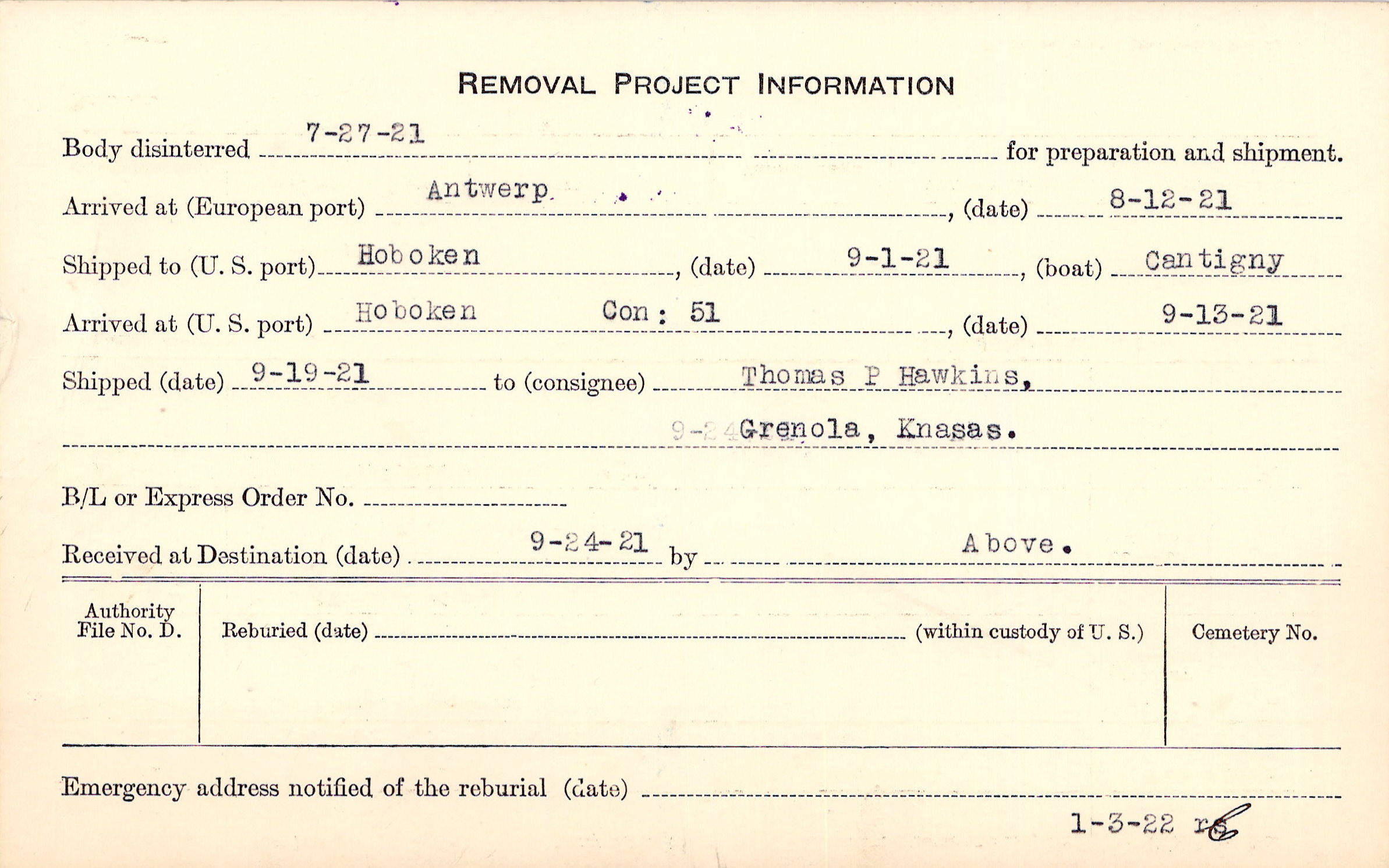 Body disinterred 7/27/1921 for preparation and shipment.