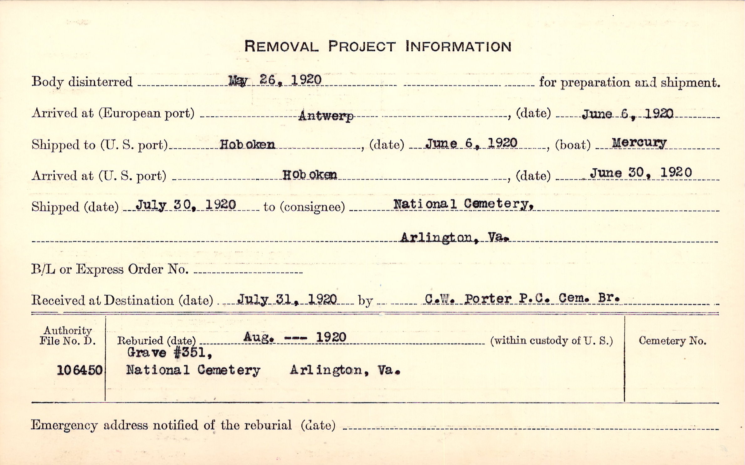 Body disinterred 5/26/1920 for preparation and shipment.