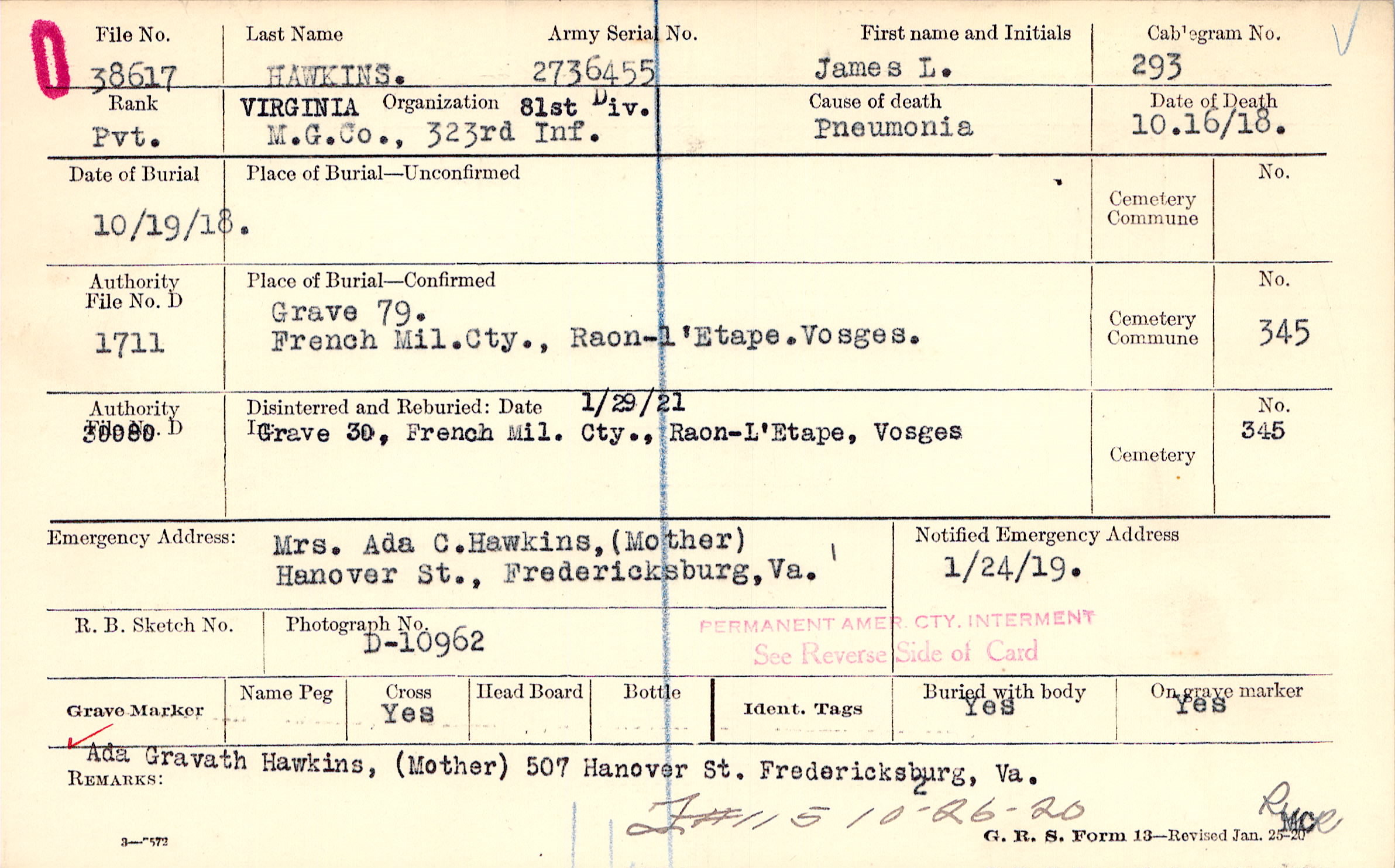 Mrs. Ada C. Hawkins, (Mother), Hanover St., Fredericksburg, Va.