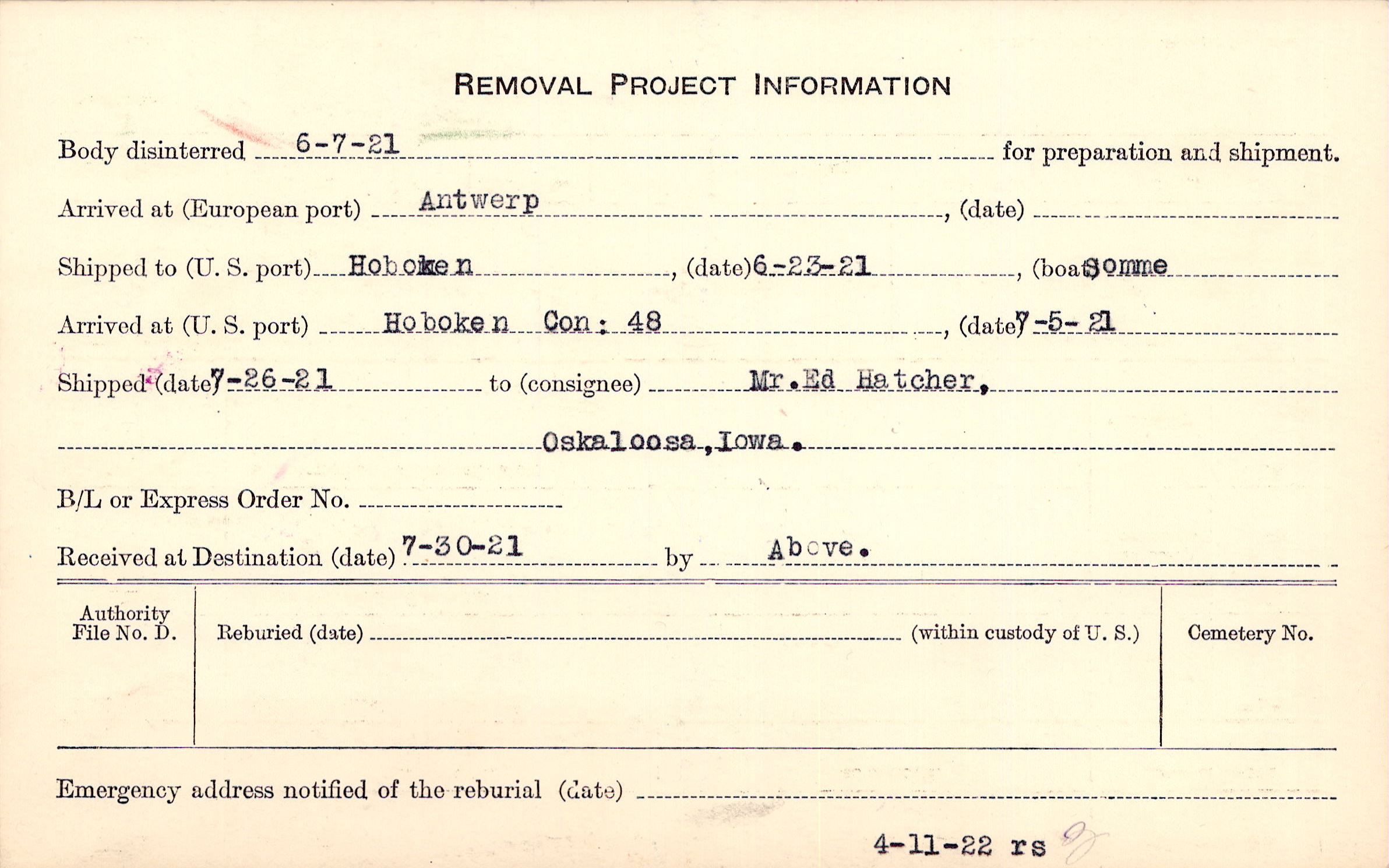 Body disinterred 6/7/1921 for preparation and shipment.