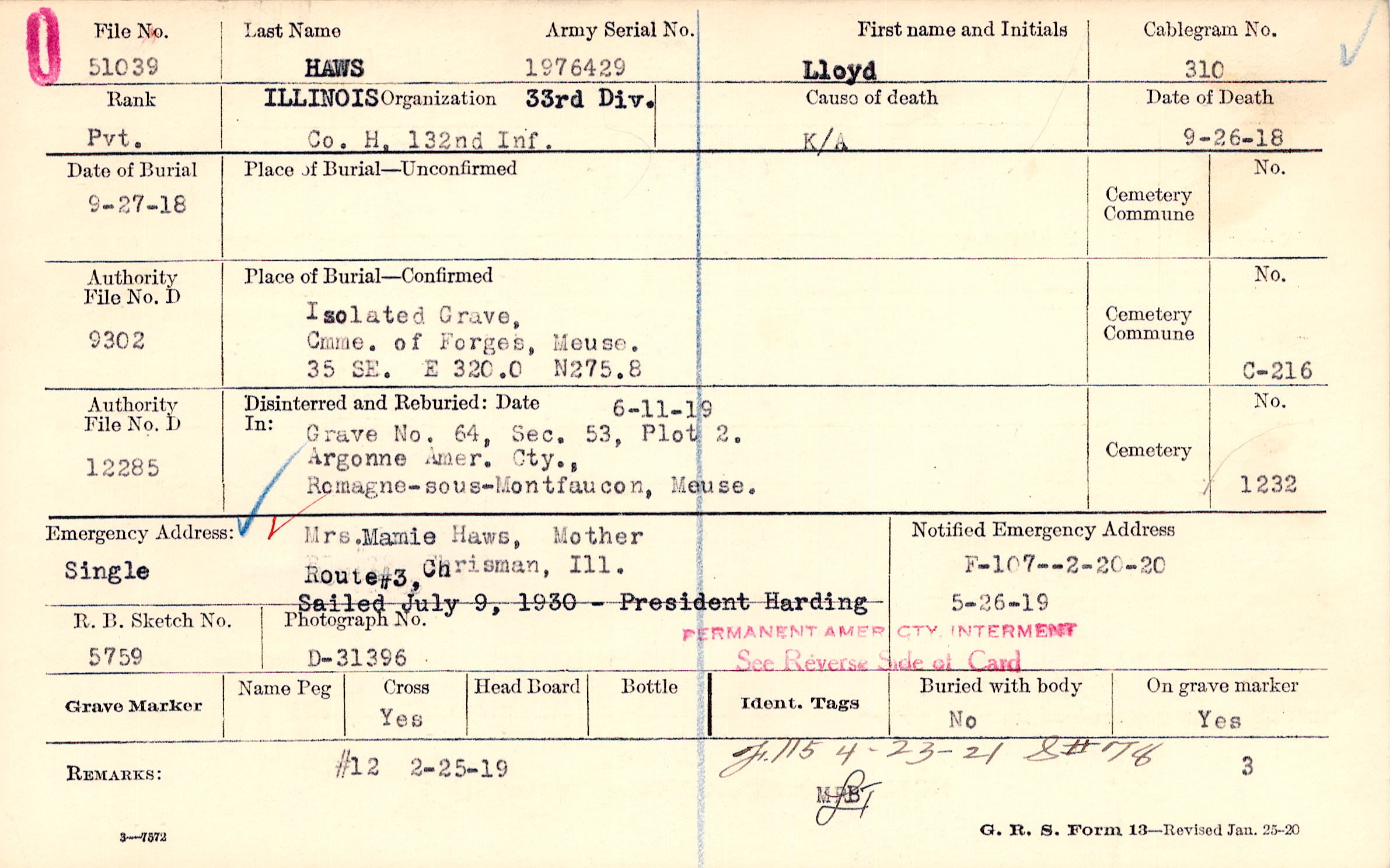 | Permanent Burial in Foreign Cemetery |