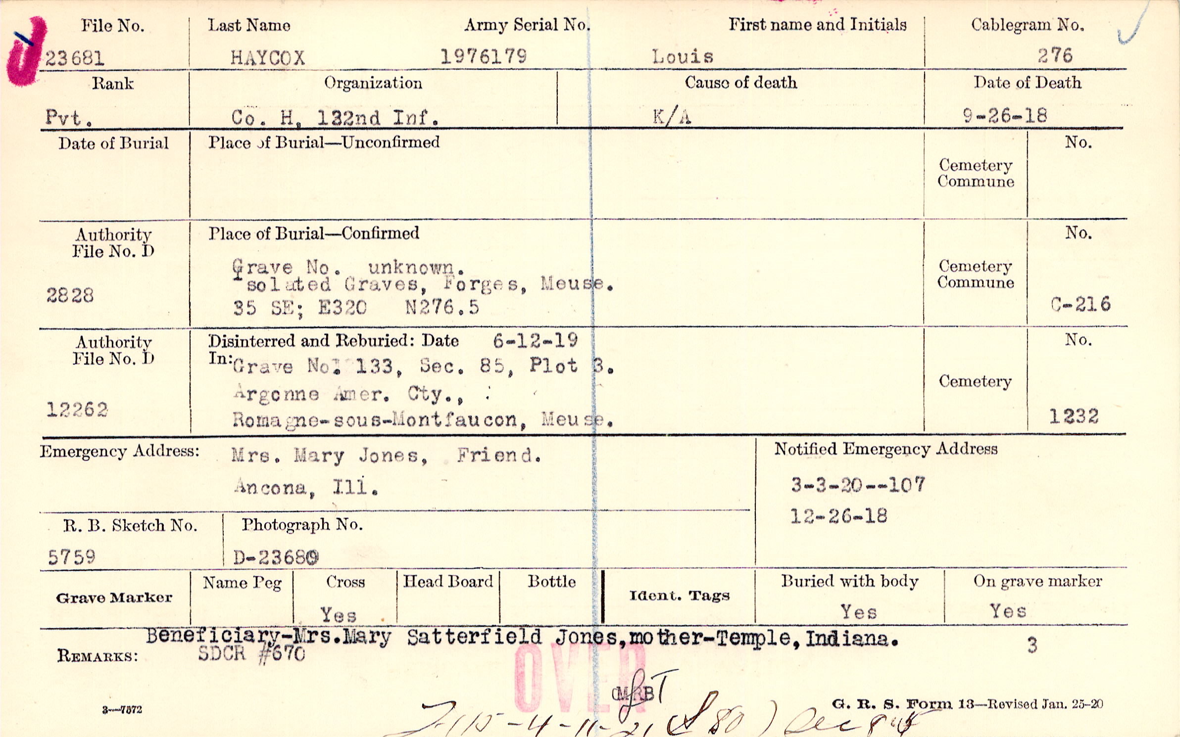 Grave 133, Section 85, Plot 3, Argonne American Cemetery, Romagne-sous-Montfaucon, Meuse