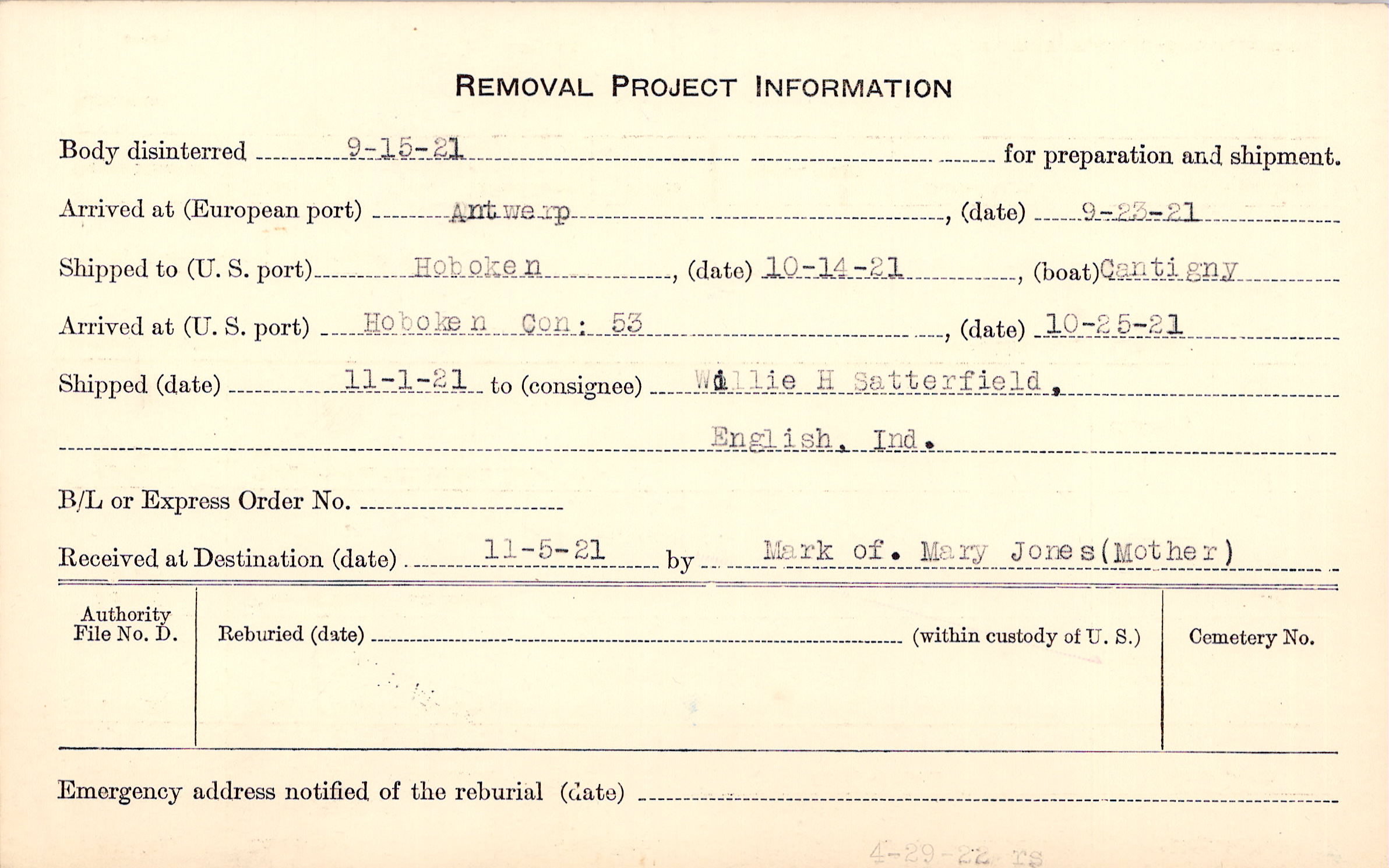 Body disinterred 9/15/1921 for preparation and shipment.