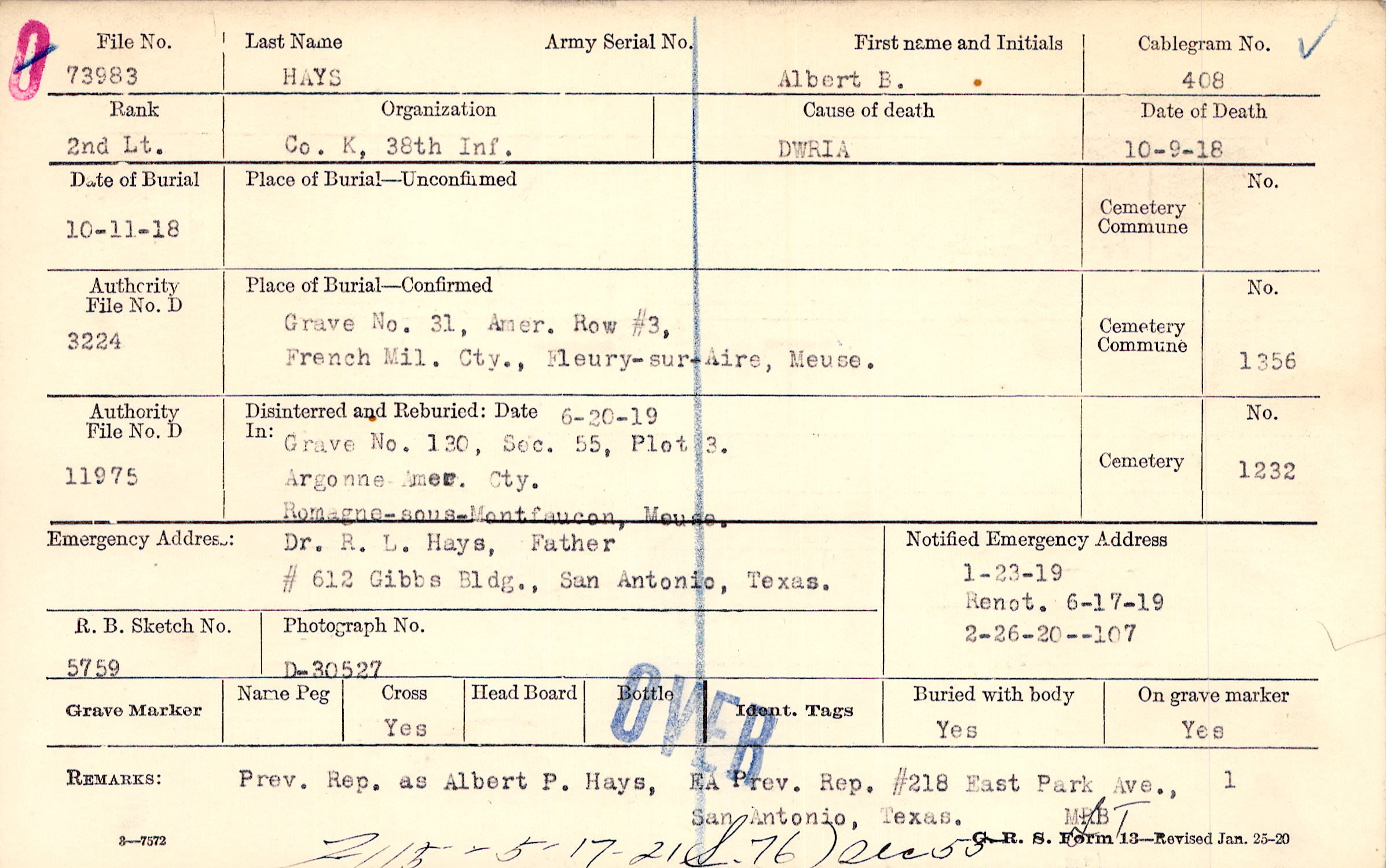 Dr. R. L. Hays, Father, # 612 Gibbs Bldg., San Antonio, Texas.