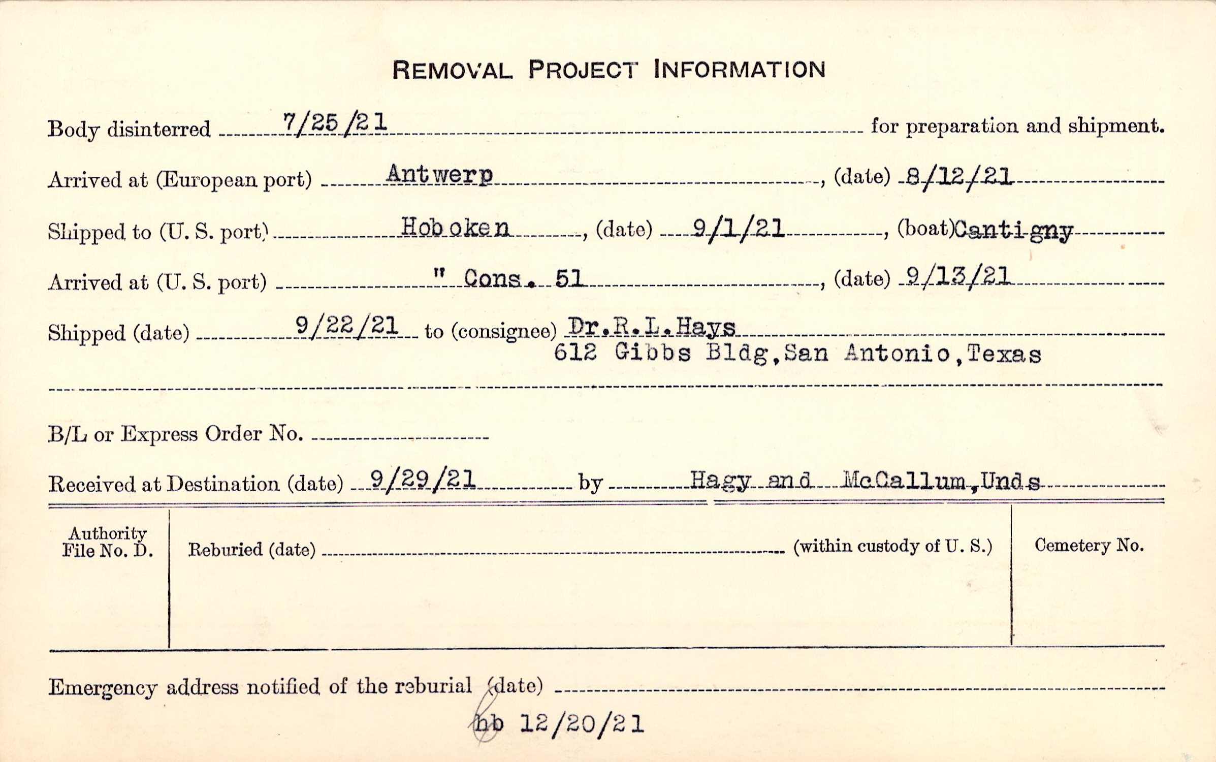Body disinterred 7/25/1921 for preparation and shipment.