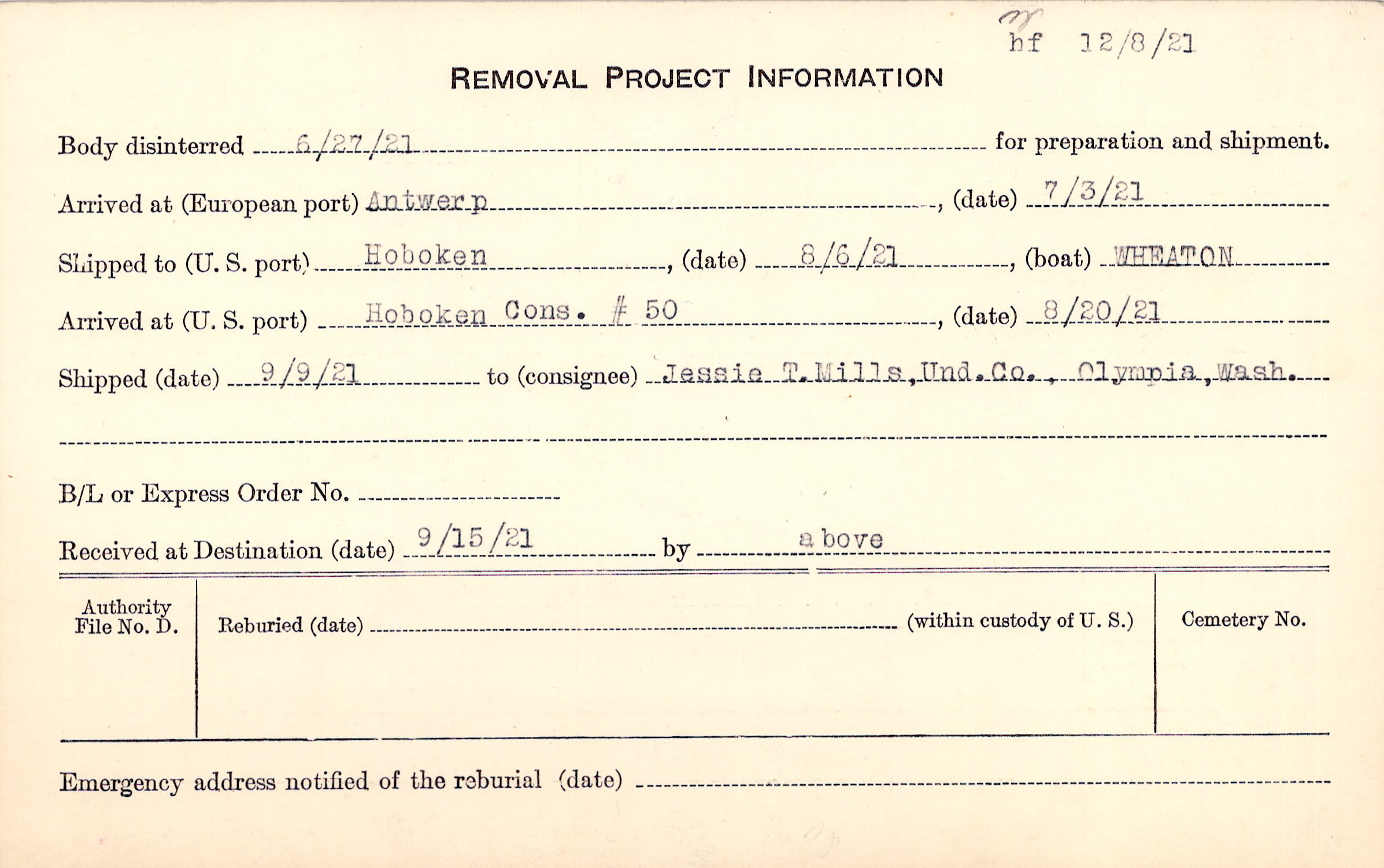 Body disinterred 6/27/1921 for preparation and shipment.