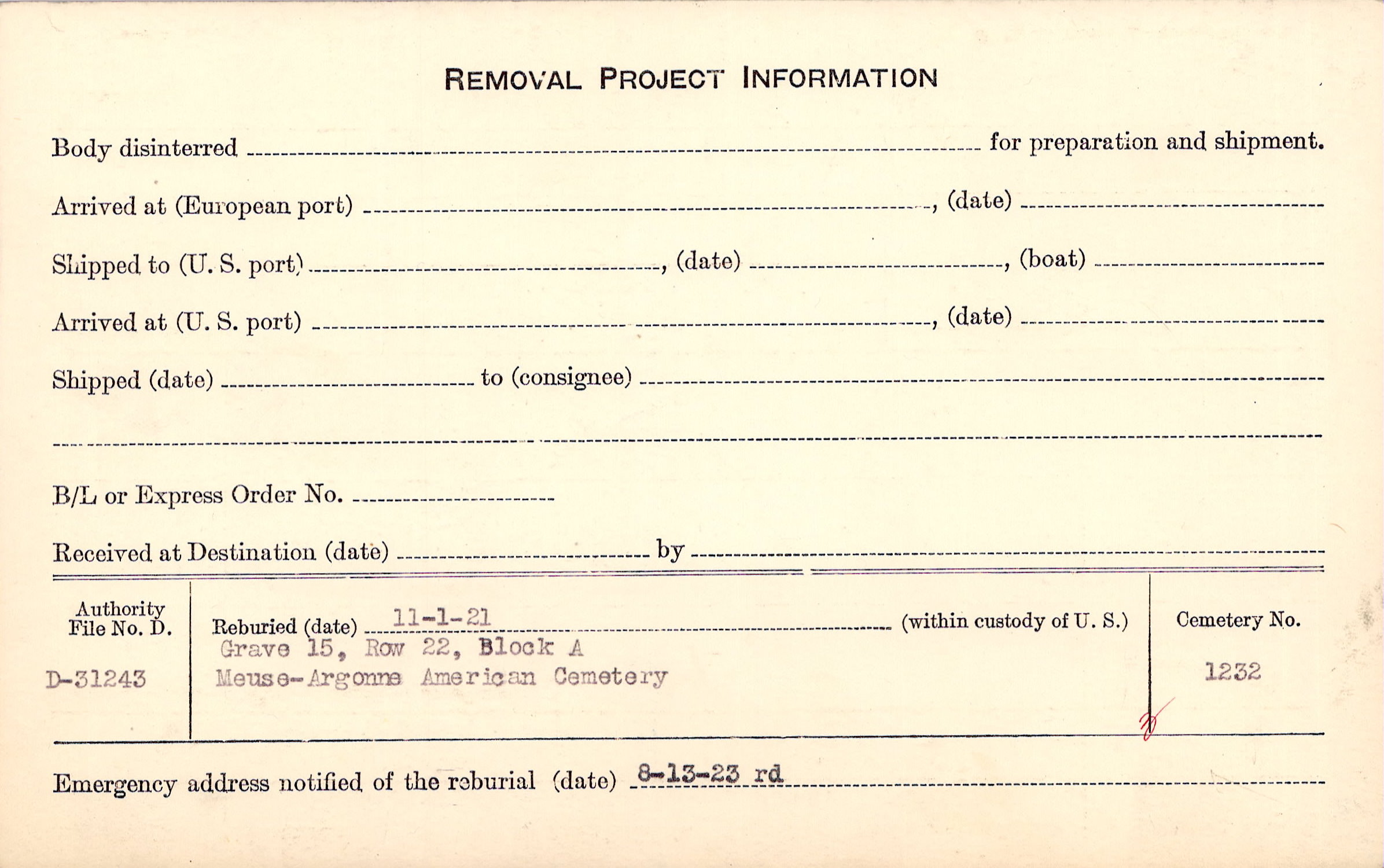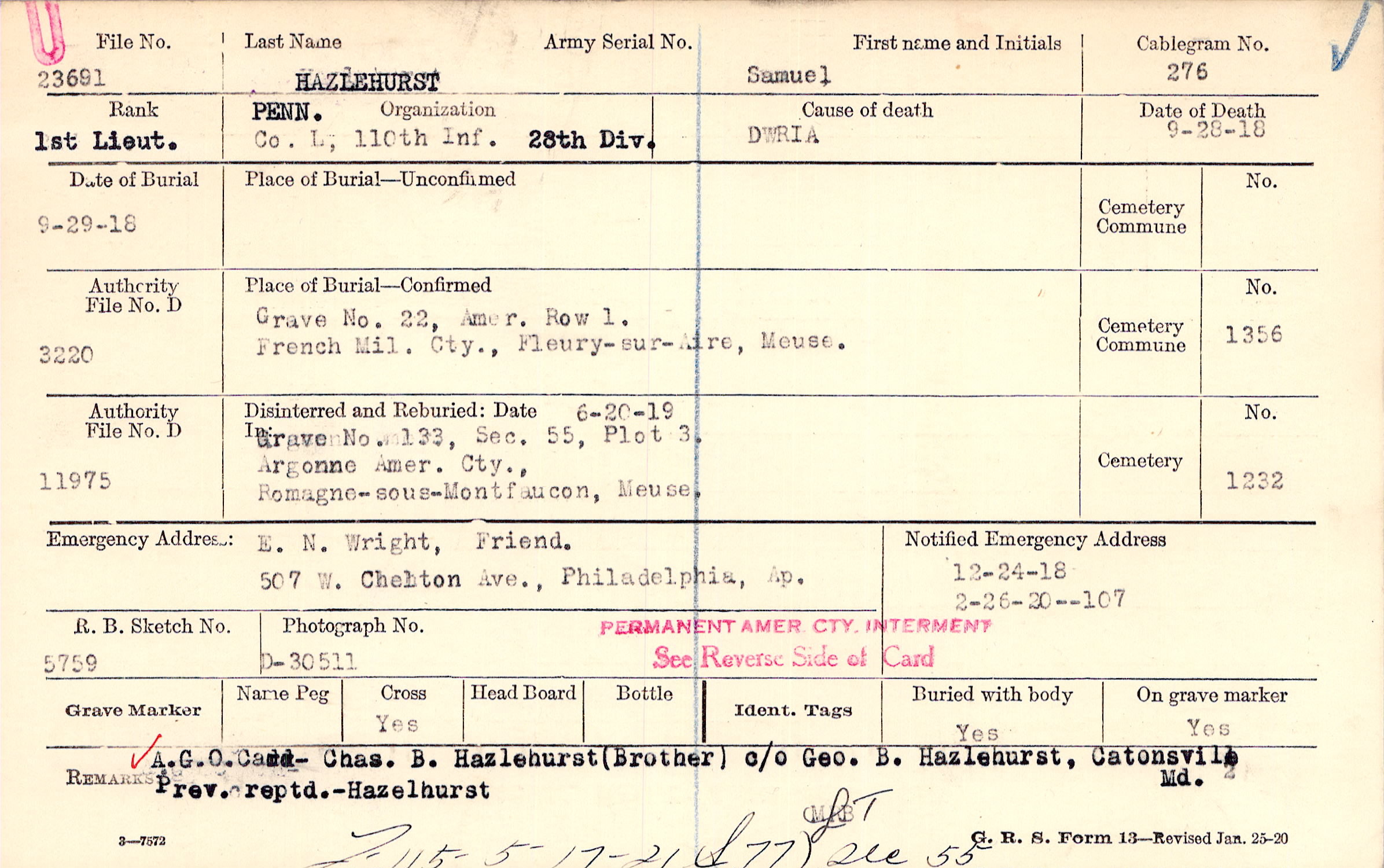 Grave 22, Amer. Row 1,French Mil, Cty., Fleury-sur-Aire, Meuse