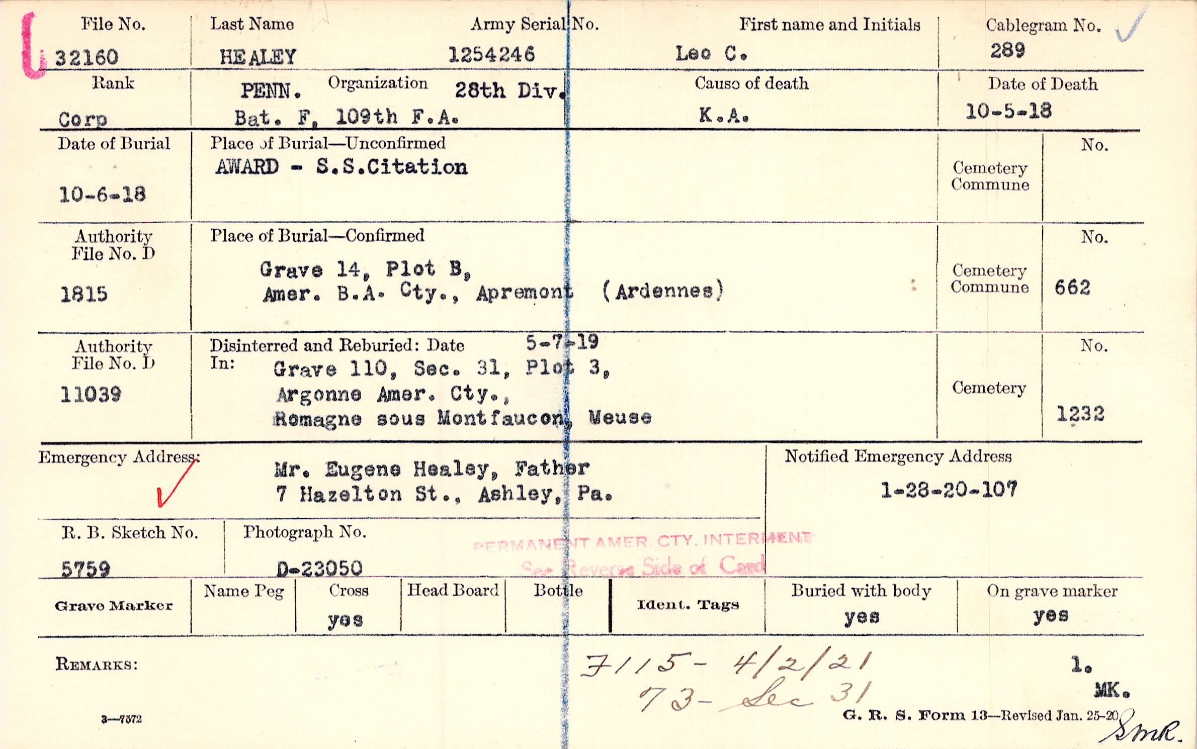 Mr. Eugene Healey, Father, 7 Hazelton St., Ashley, Pa.