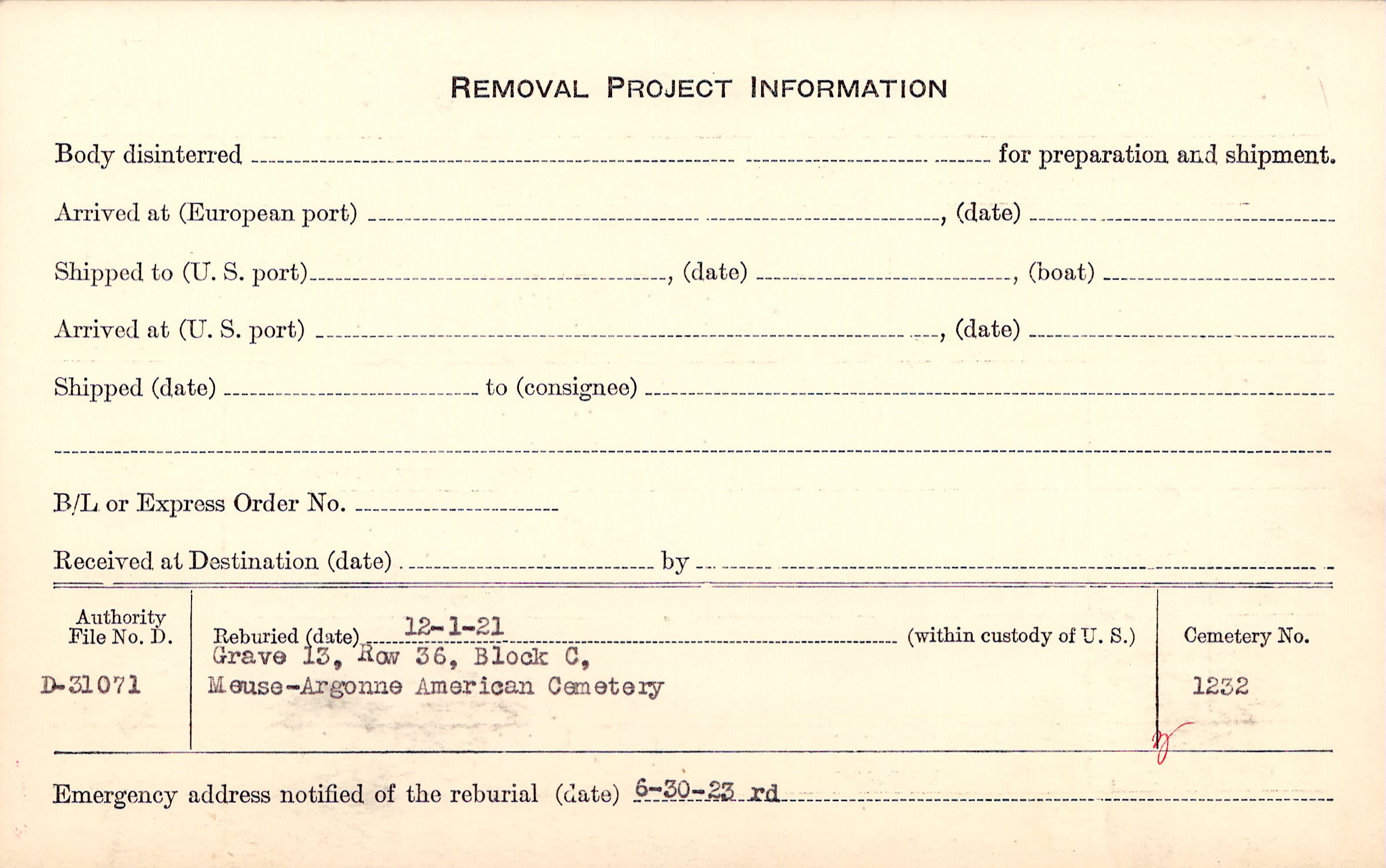 | Permanent Burial in Foreign Cemetery |