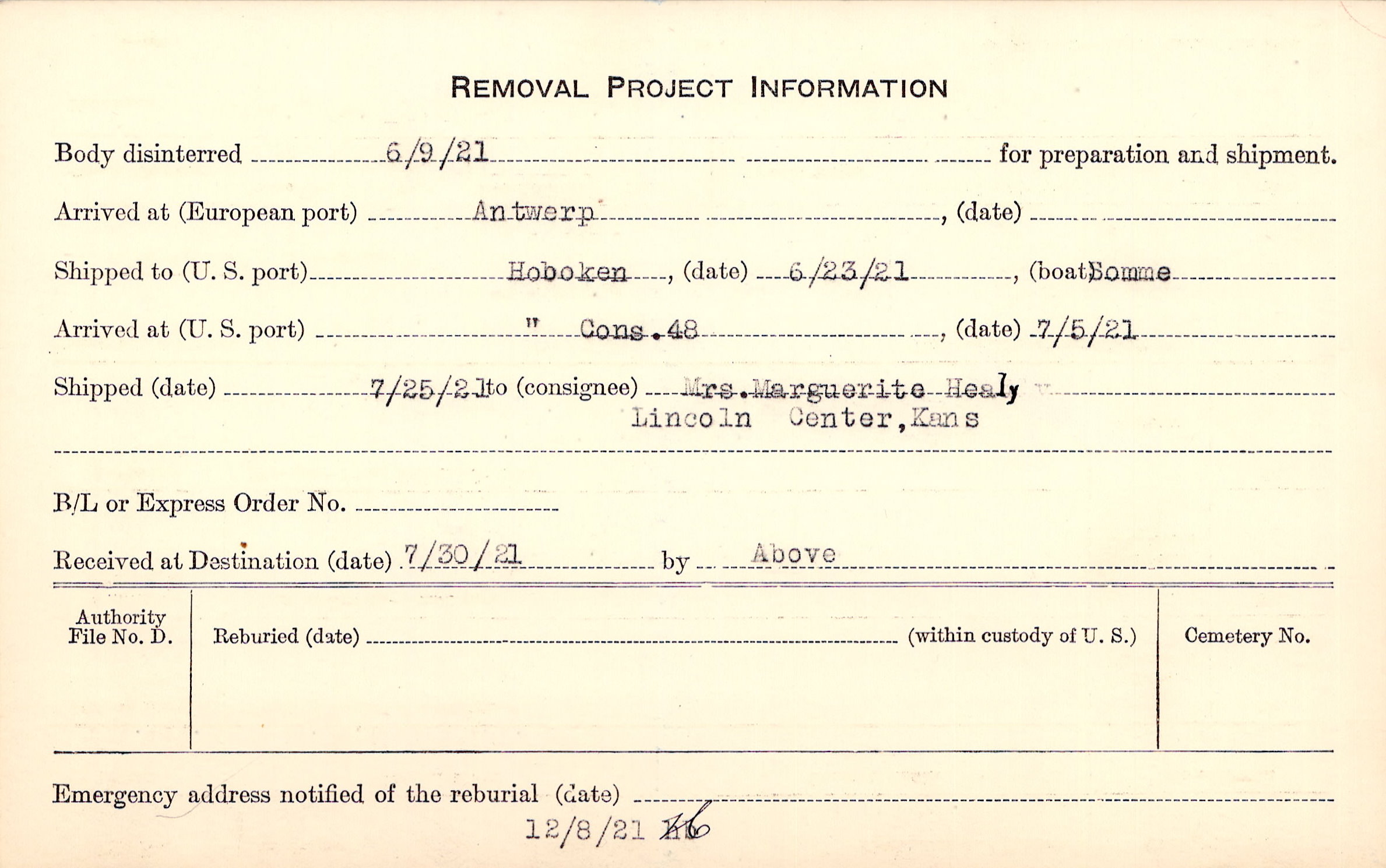 Body disinterred 6/9/1921 for preparation and shipment.