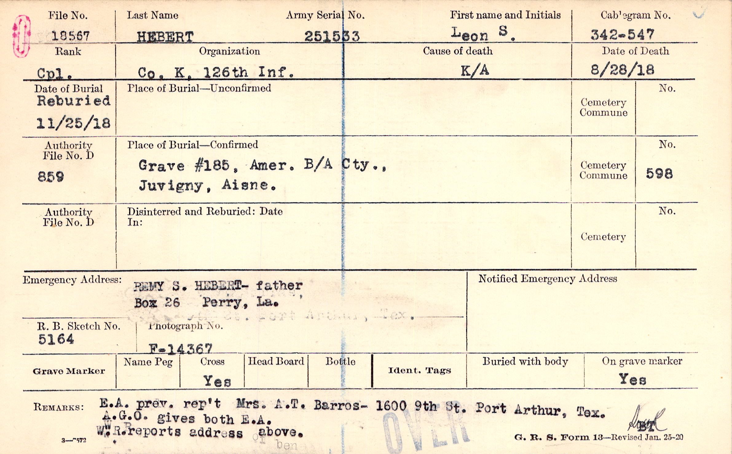 REMY S. HEBERT- father, Box 26 Perry, La.