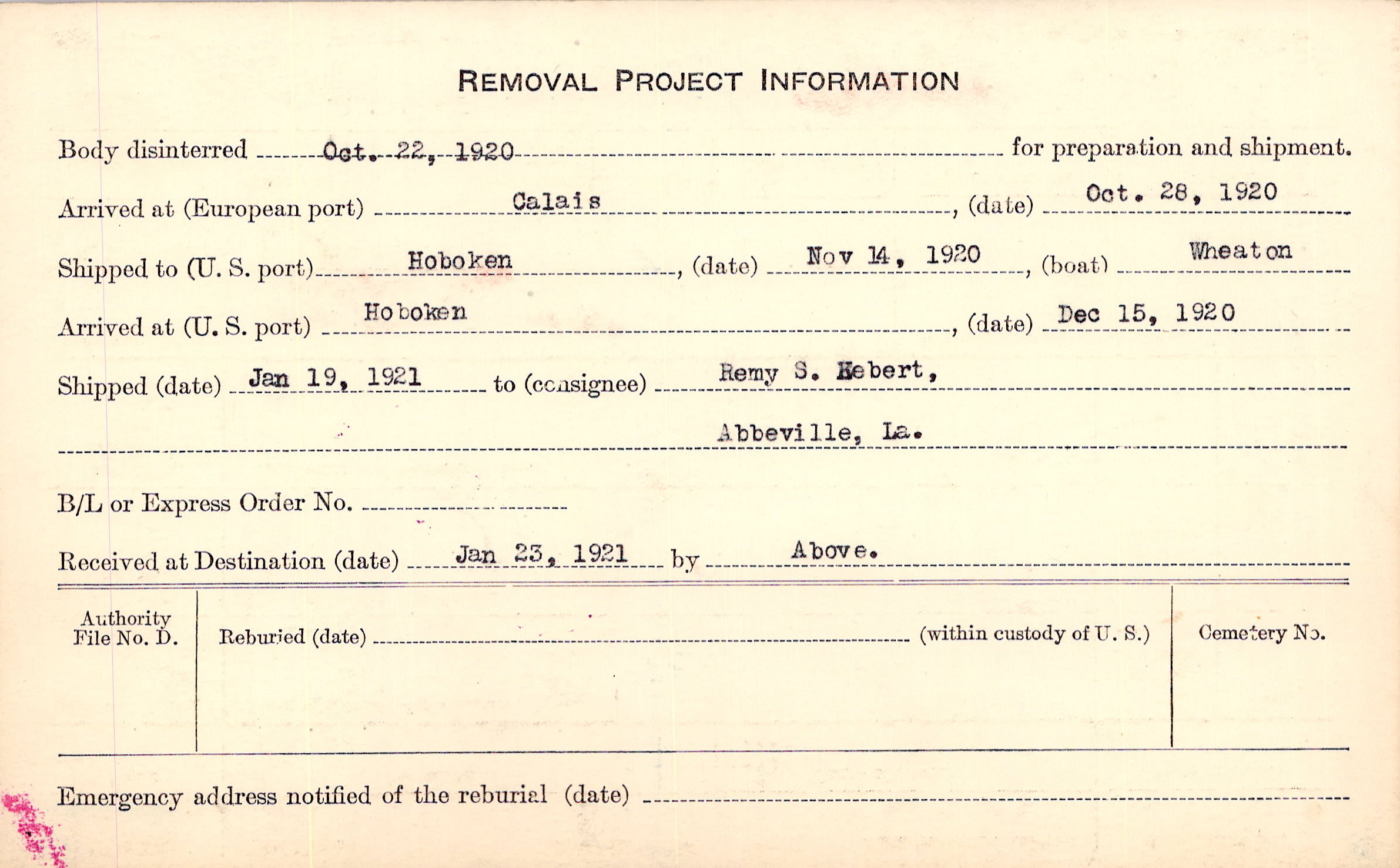 Body disinterred 10/22/1920 for preparation and shipment.