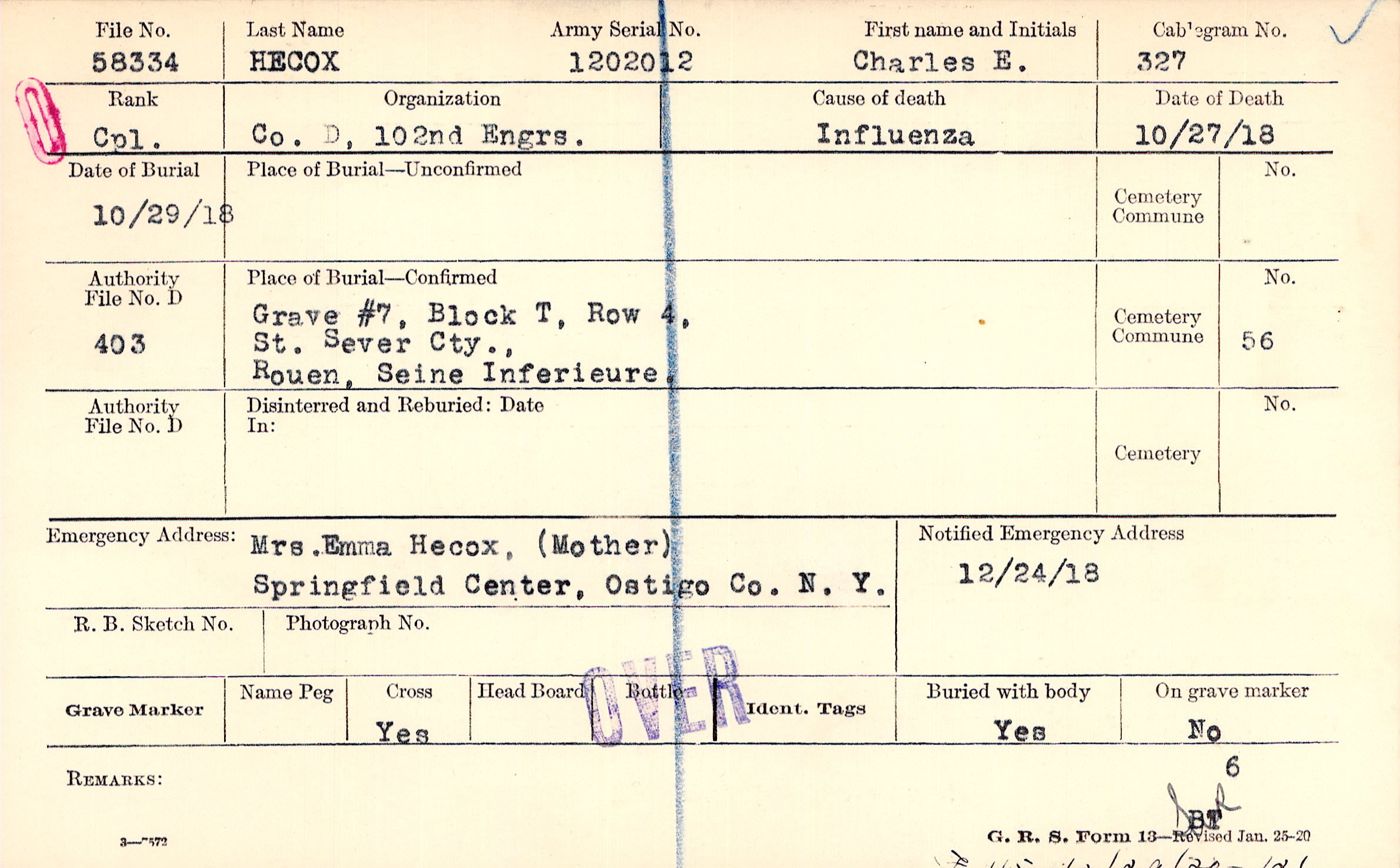 Mrs. Emma Hecox, (Mother), Springfield Center, Ostigo Co. N. Y.