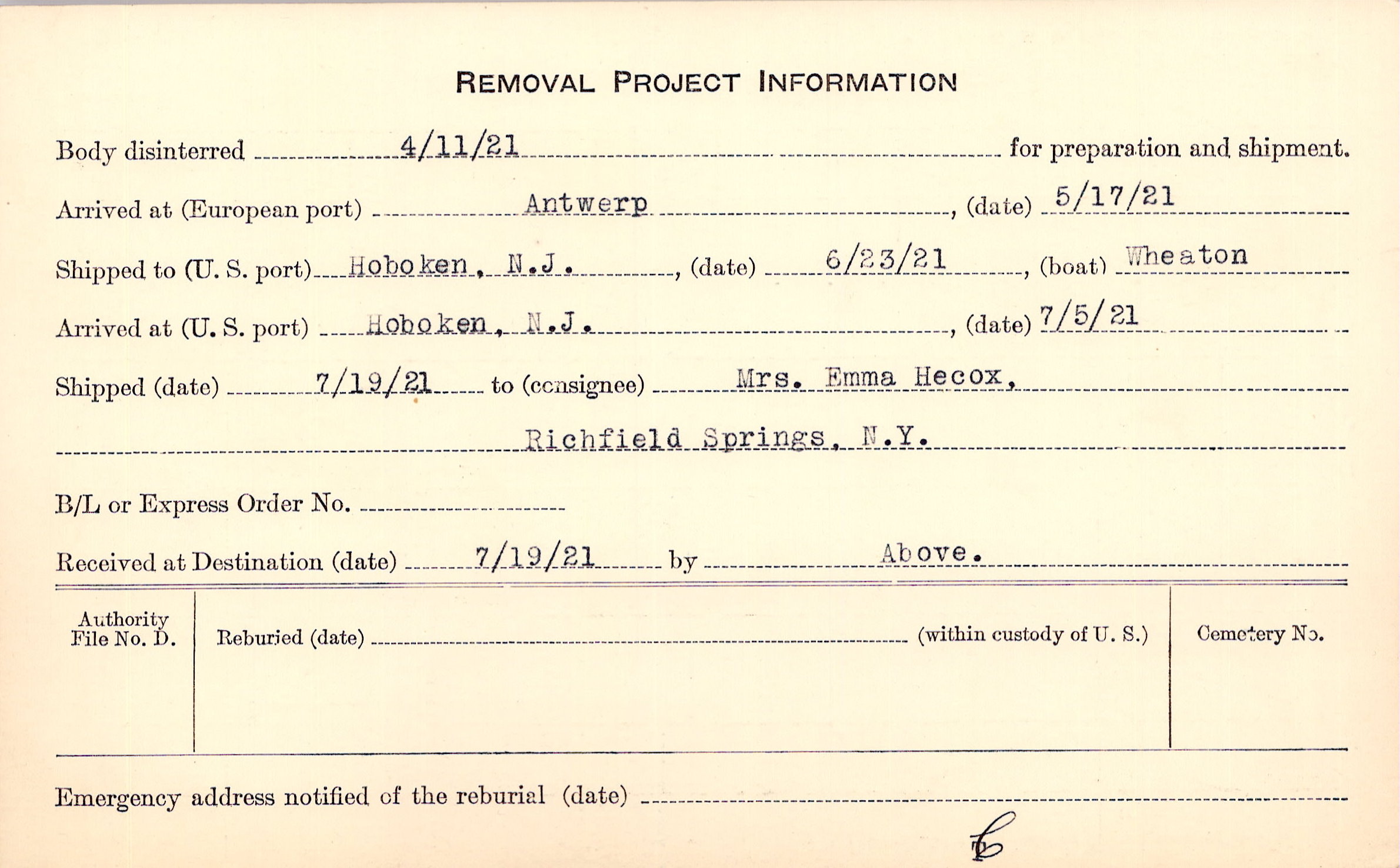 Body disinterred 4/11/1921 for preparation and shipment.