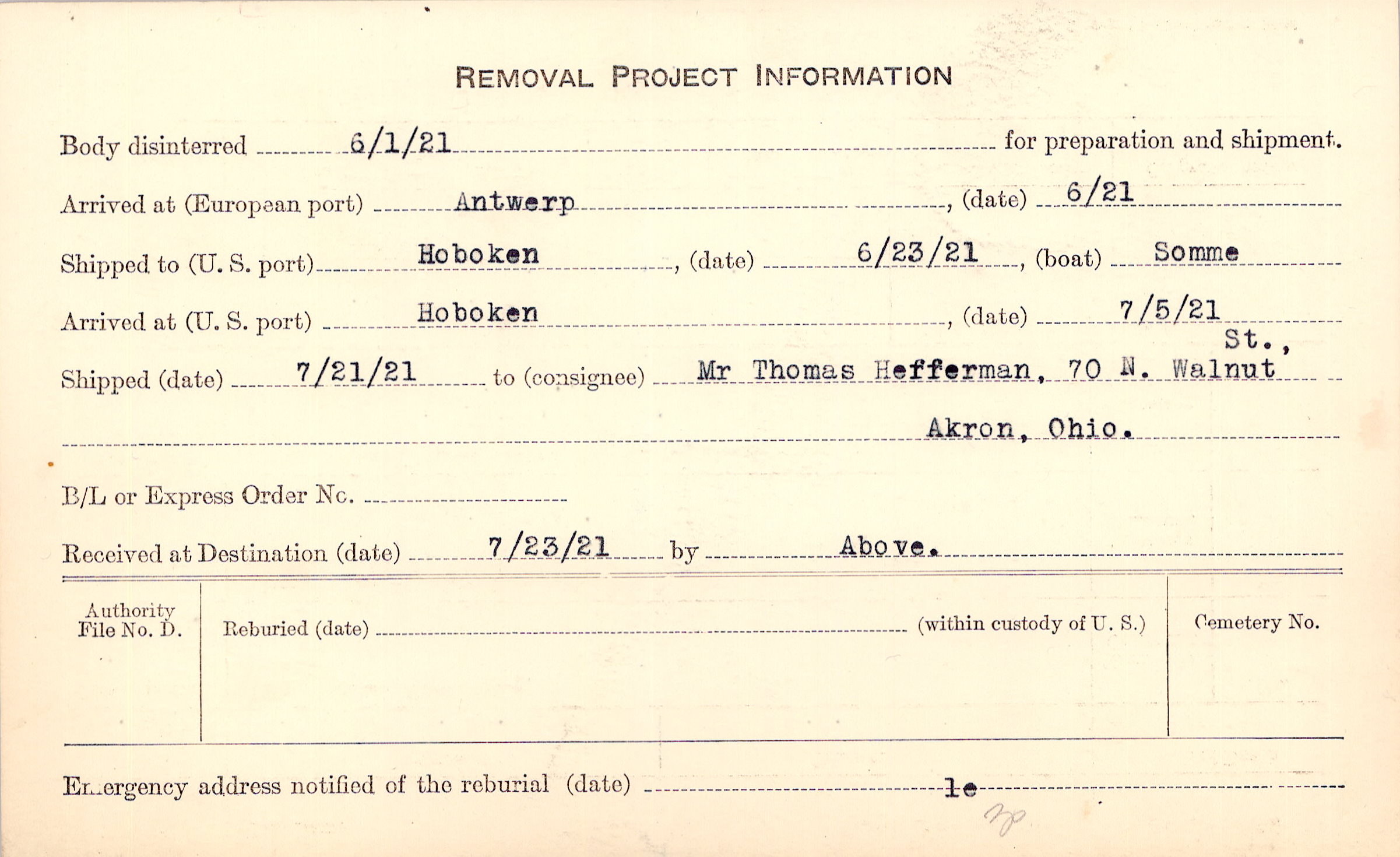 Body disinterred 6/1/1921 for preparation and shipment.