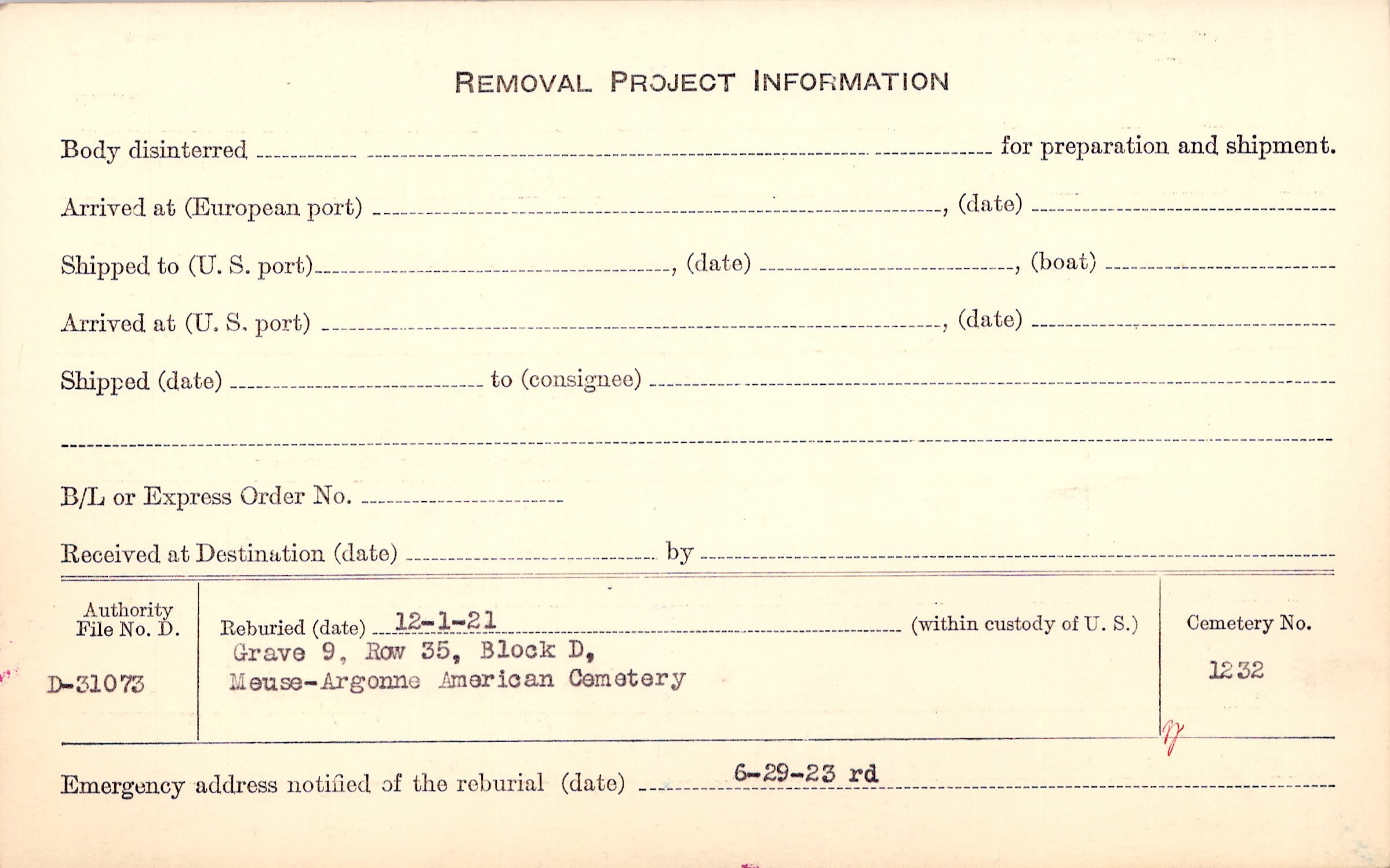 | Permanent Burial in Foreign Cemetery |
