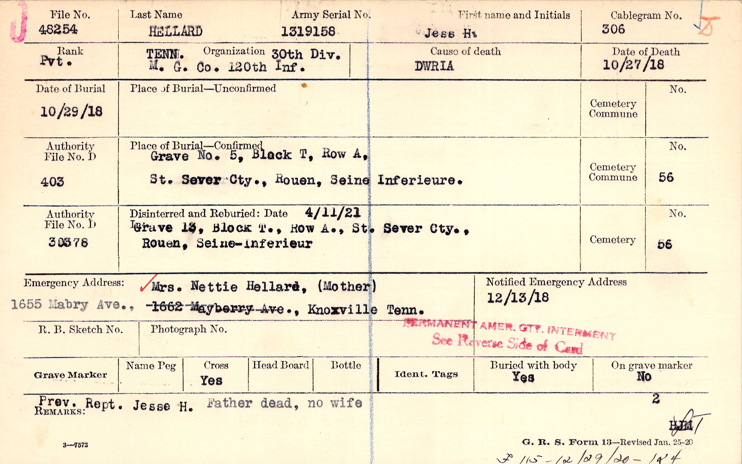 Mrs. Nettie Hellard, (Mother), 1655 Mabry Ave., Knoxville Tenn.