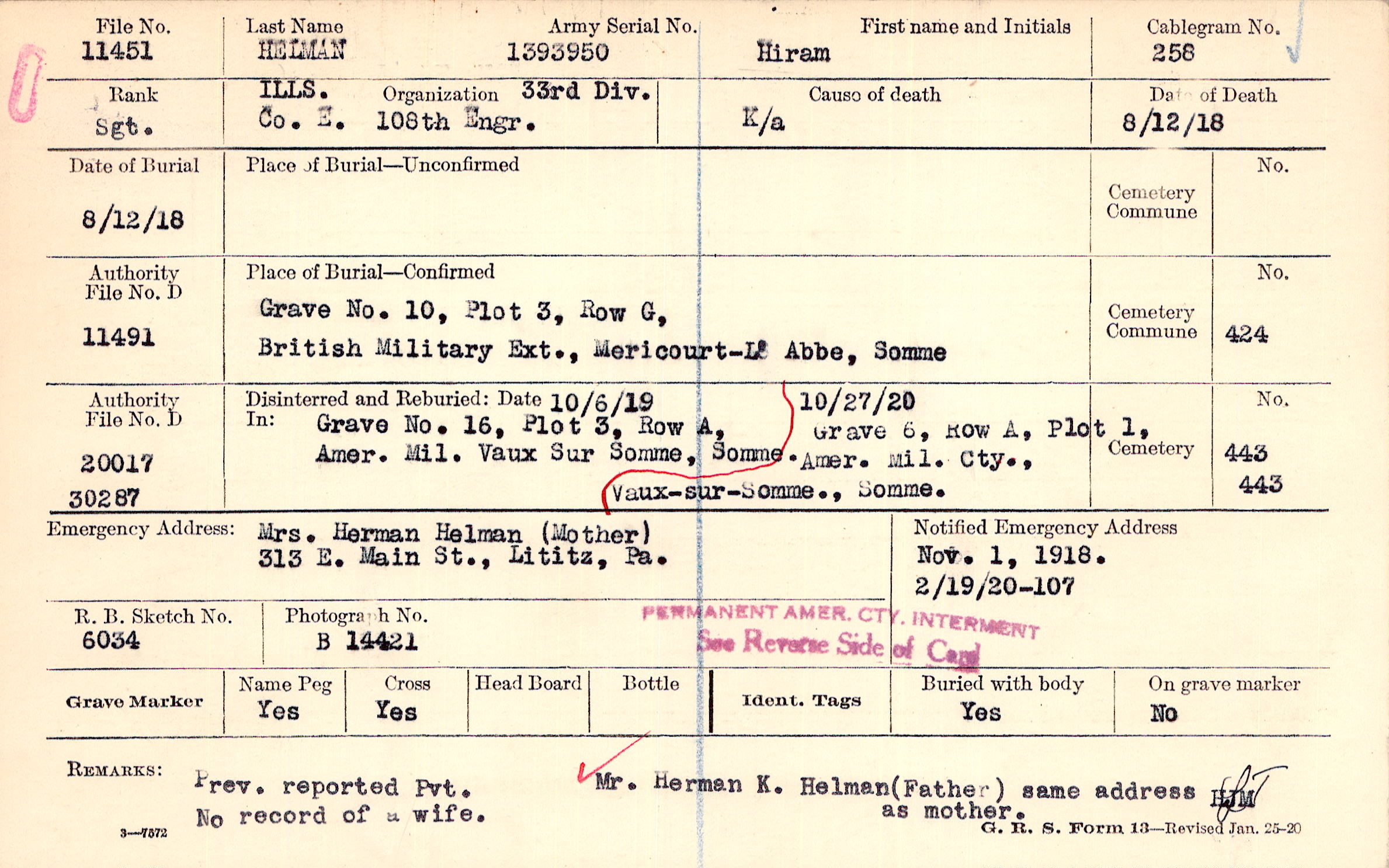 Prev. reported Pvt. No record of a wife Mr. Herman K. Helman (Father) same address as mother.