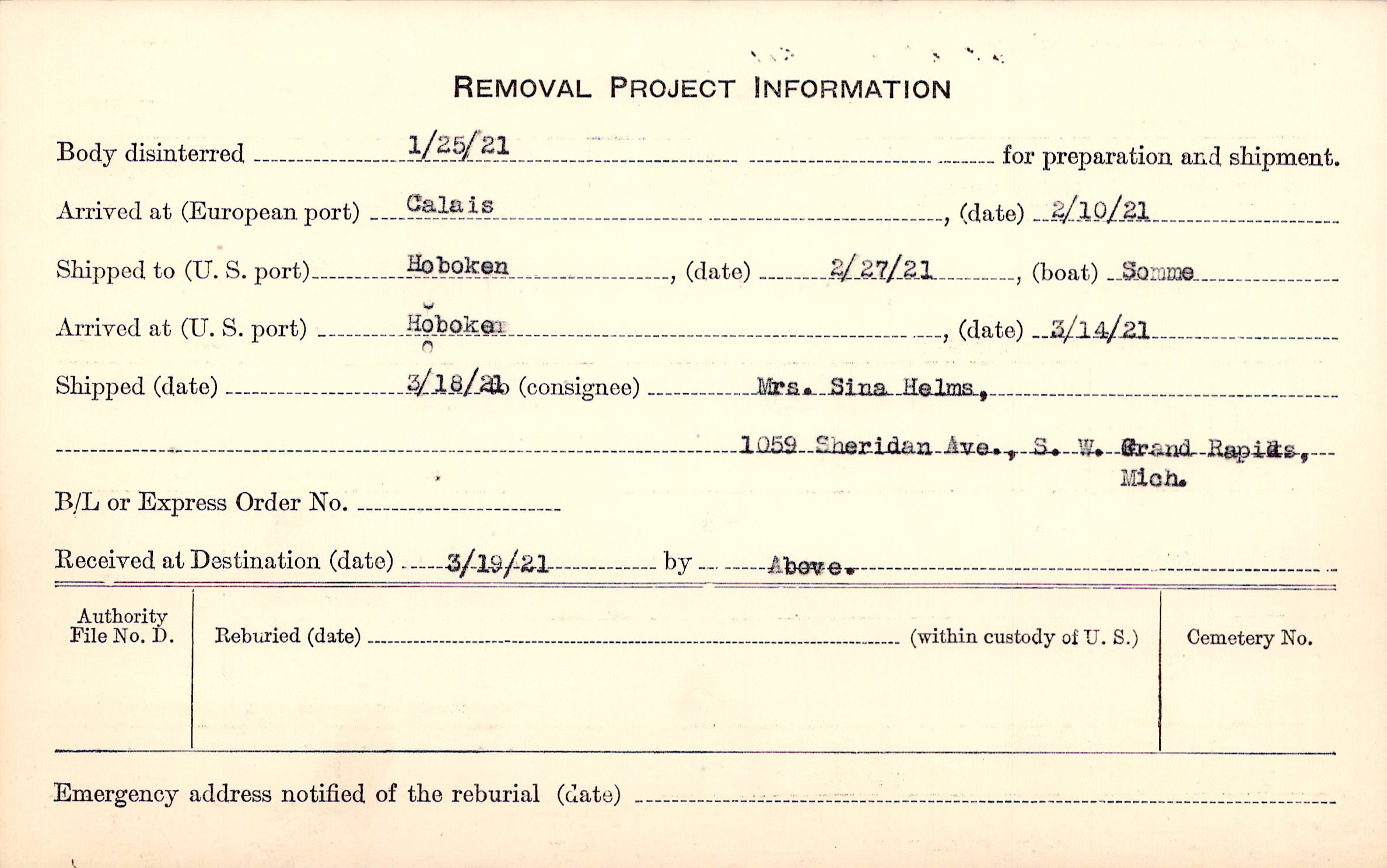Body disinterred 1/25/1921 for preparation and shipment.
