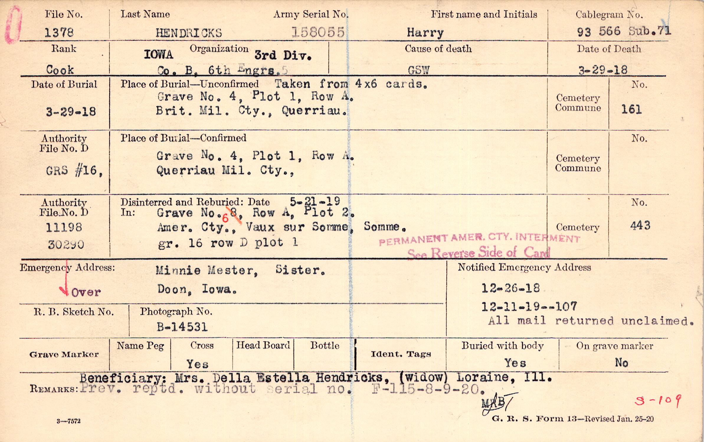Beneficiary: Mrs. Della Estella Hendricks, (widow) Loraine, Ill. S-109, F-115-8-9-20