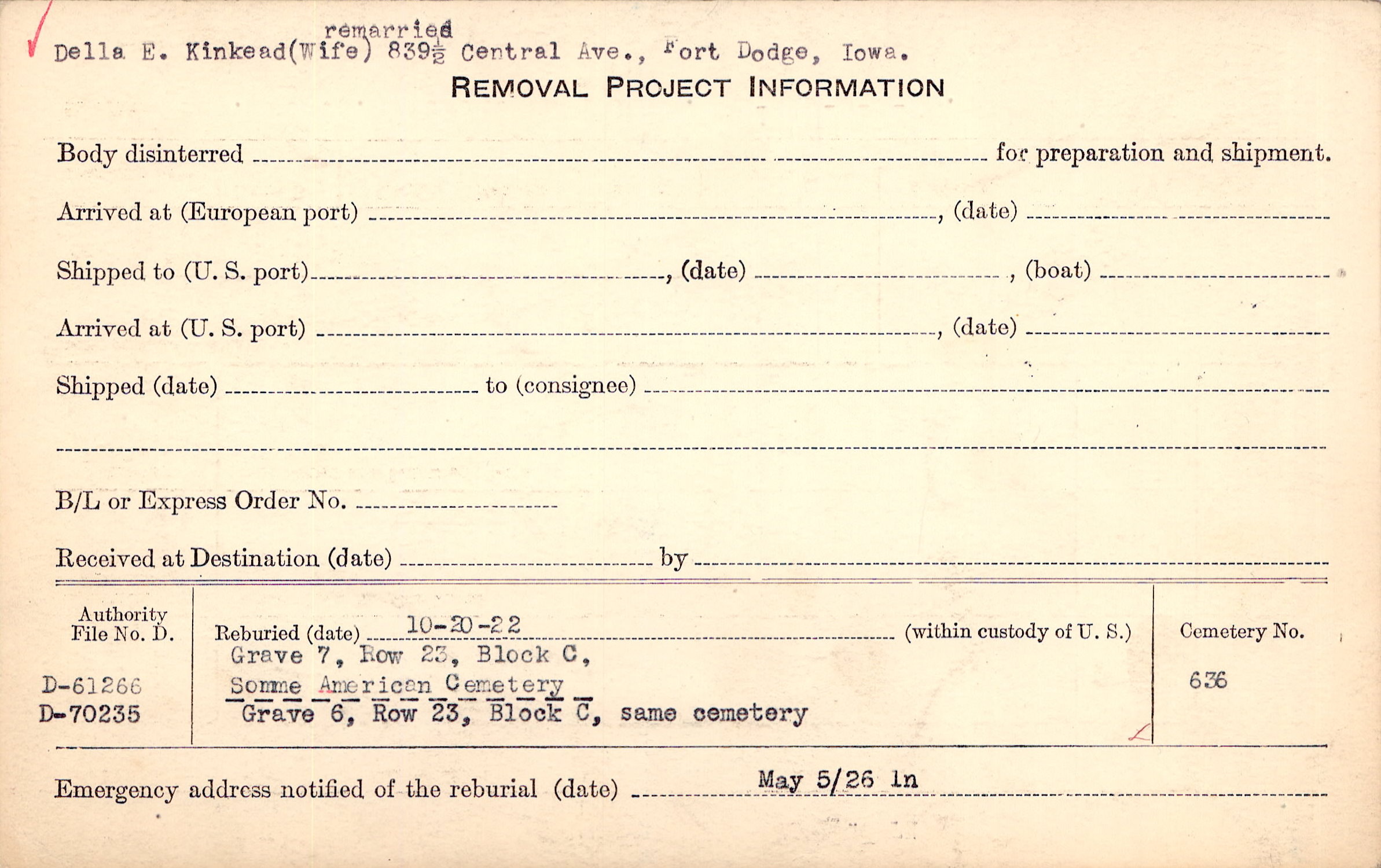 Della E. Kinkead (Wife), remarried, 8391/2 Central Ave., Fort Dodge, Iowa. |