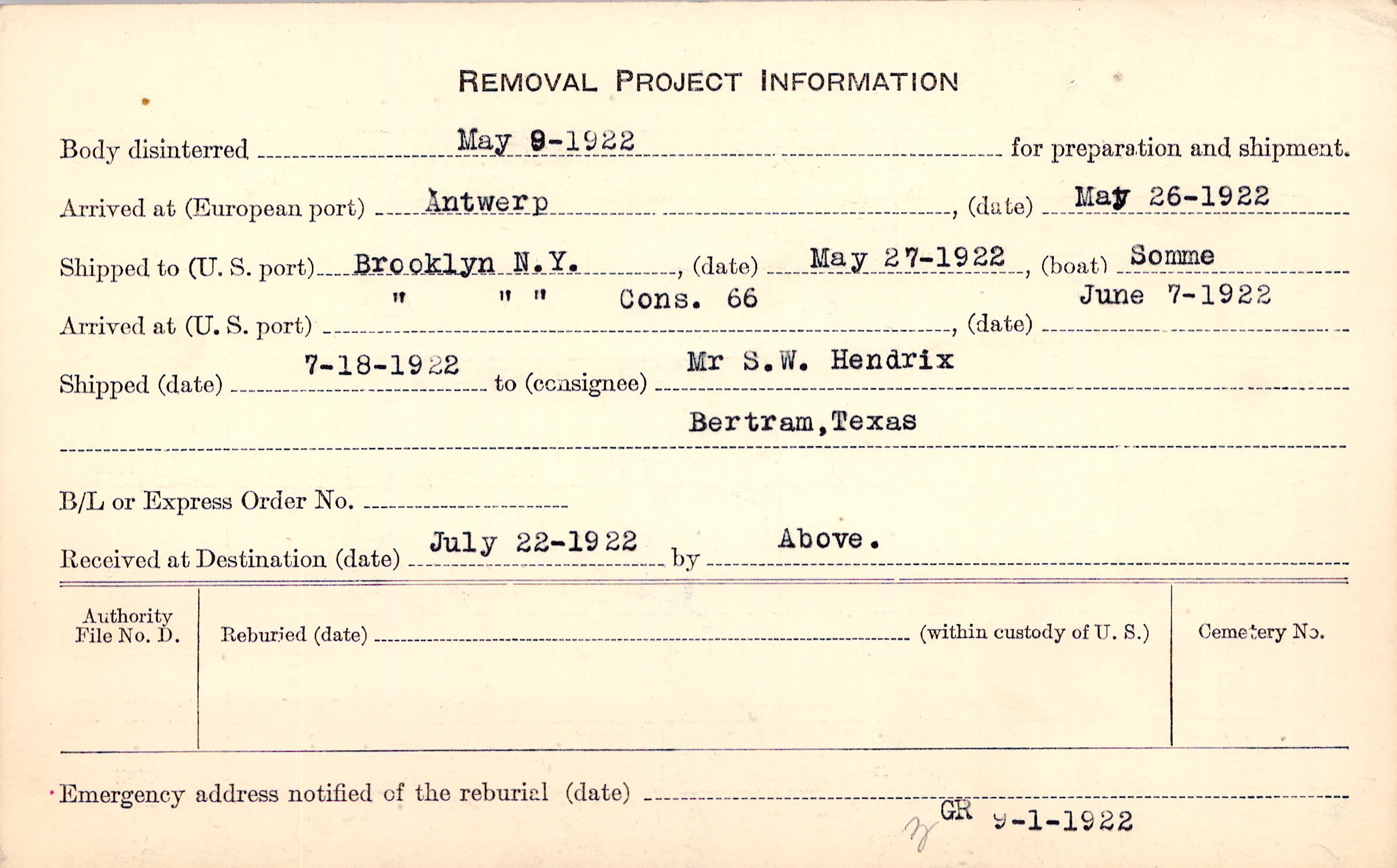 Body disinterred 5/9/1922 for preparation and shipment.