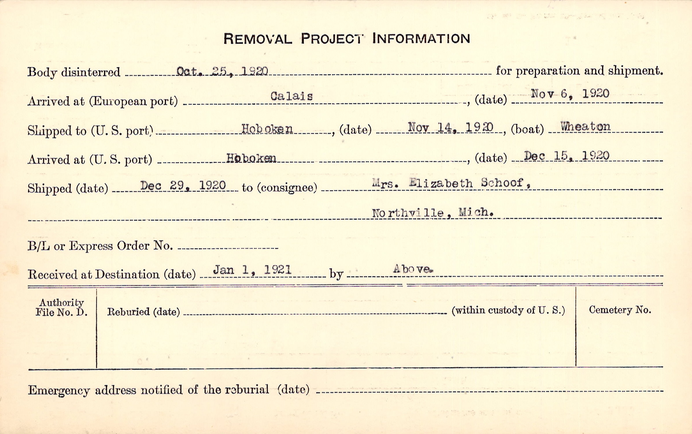 to Mrs. Elizabeth Schoof, Northville, Mich.