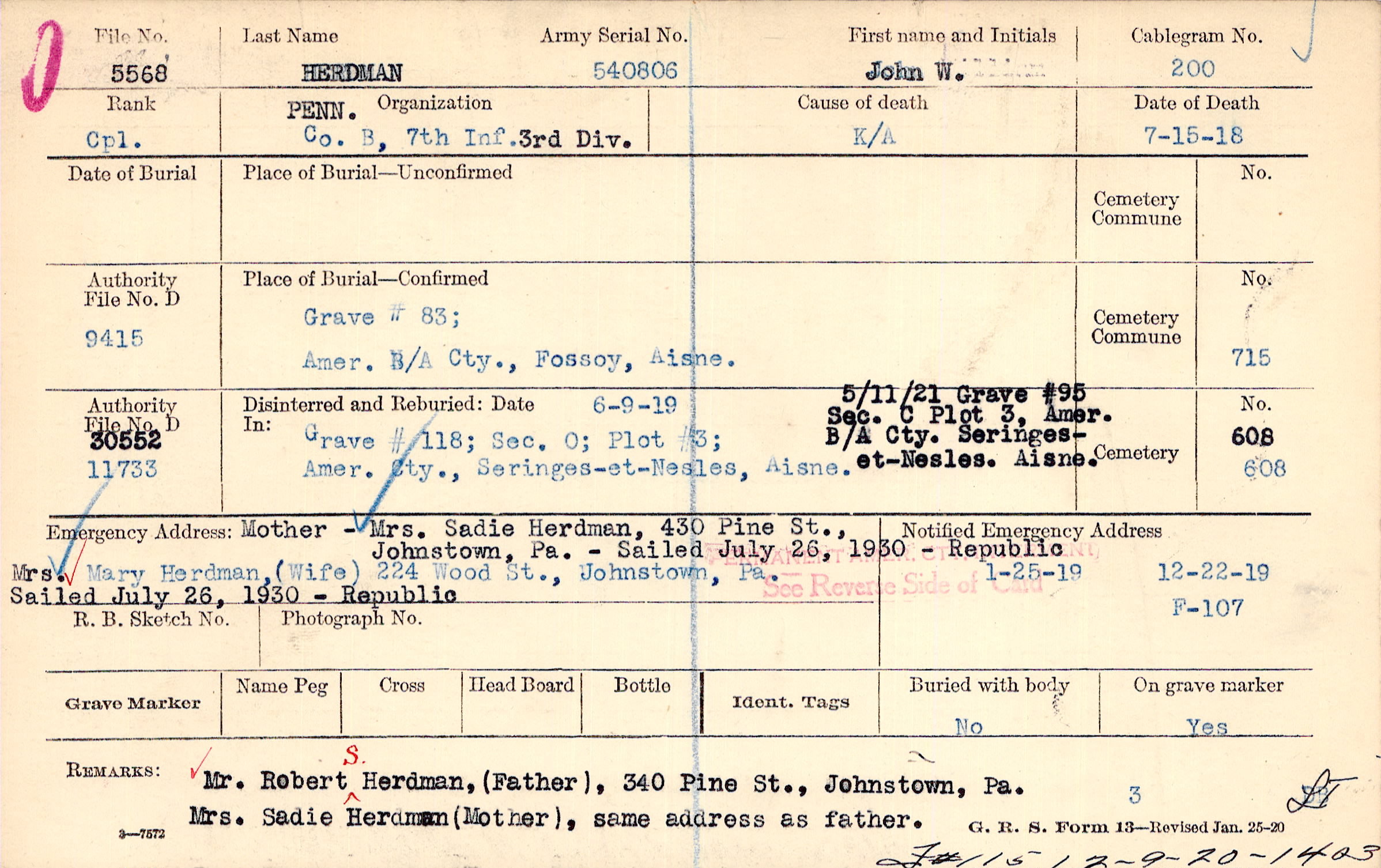 Mother - Mrs. Sadie Herdman,, 430 Pine St., Johnstown, Pa. 224 Wood St., Johnstown, Pa., Mother - Mrs. Sadie Herdman, 430 Pine St., Johnstown, Pa. - Sailed July 26, 1930 - Republic Sailed July 26, 1930 - Republic