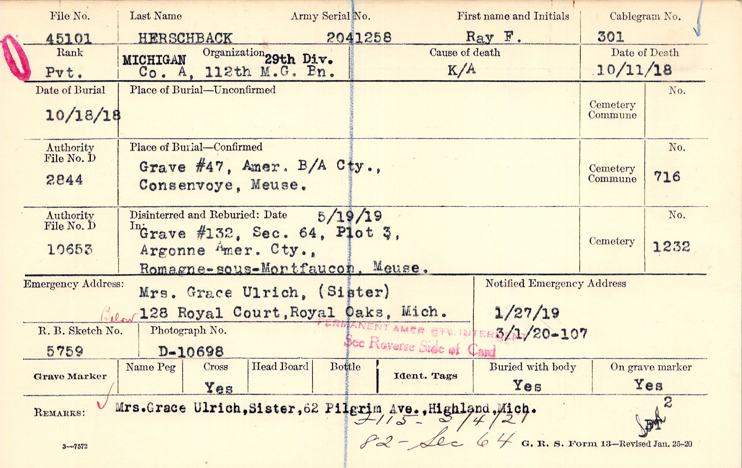 Mrs. Grace Ulrich, (Sister), 128 Royal Court, Royal Oaks, Mich., Below