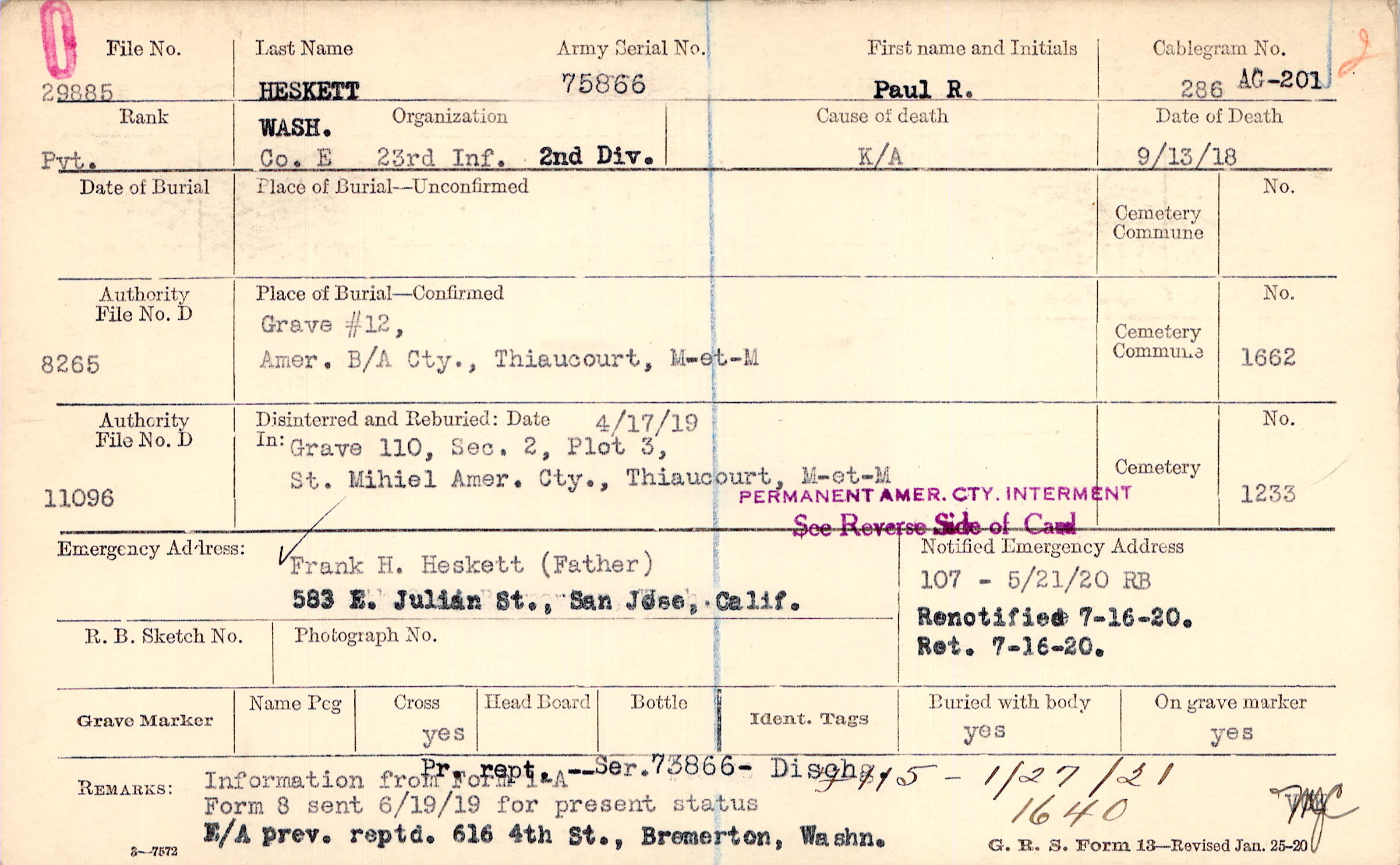 Frank H. Heskett (Father), 583 E. Julian St., San Jose, Calif.