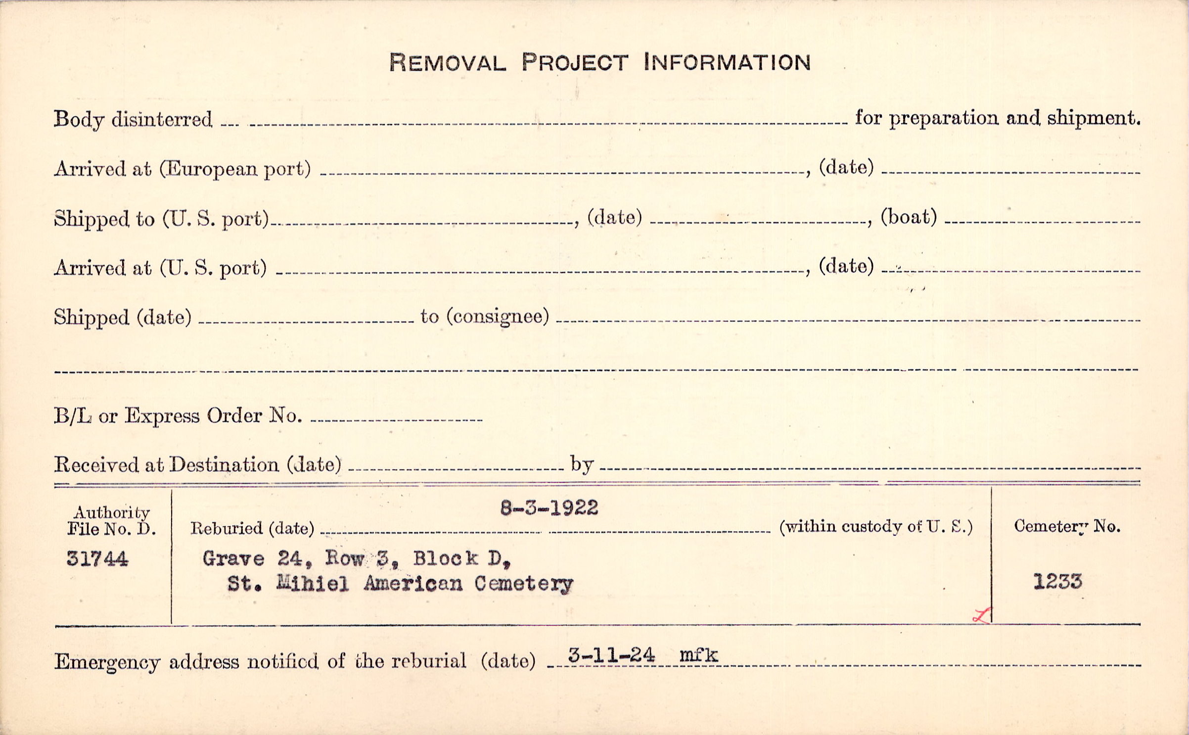 | Permanent Burial in Foreign Cemetery |
