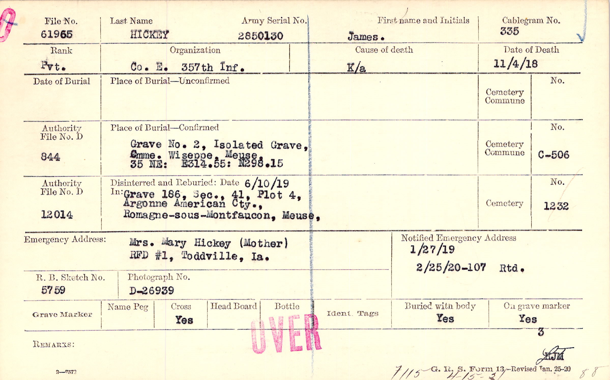 Mrs. Mary Hickey (Mother), RFD #1, Toddville, Ia., RTD.