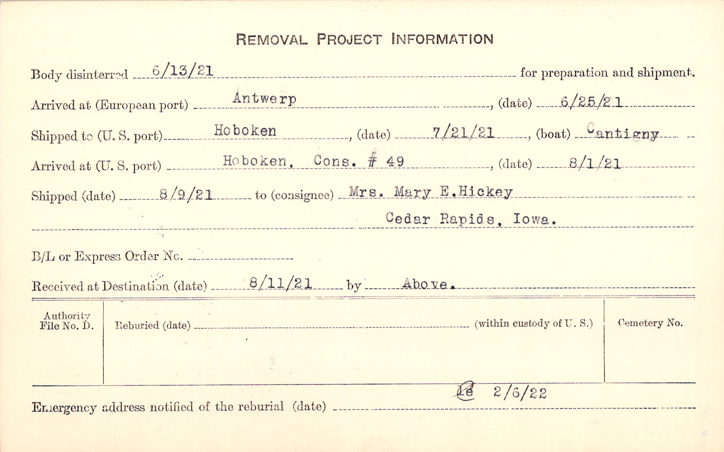 Body disinterred 6/13/1921 for preparation and shipment.