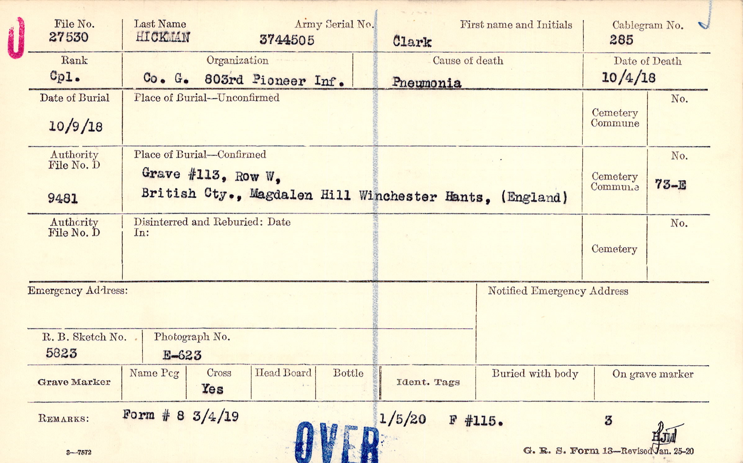 Grave #113, Row W, British Cty., Magdalen Hill, Winchester, Hants, (England)