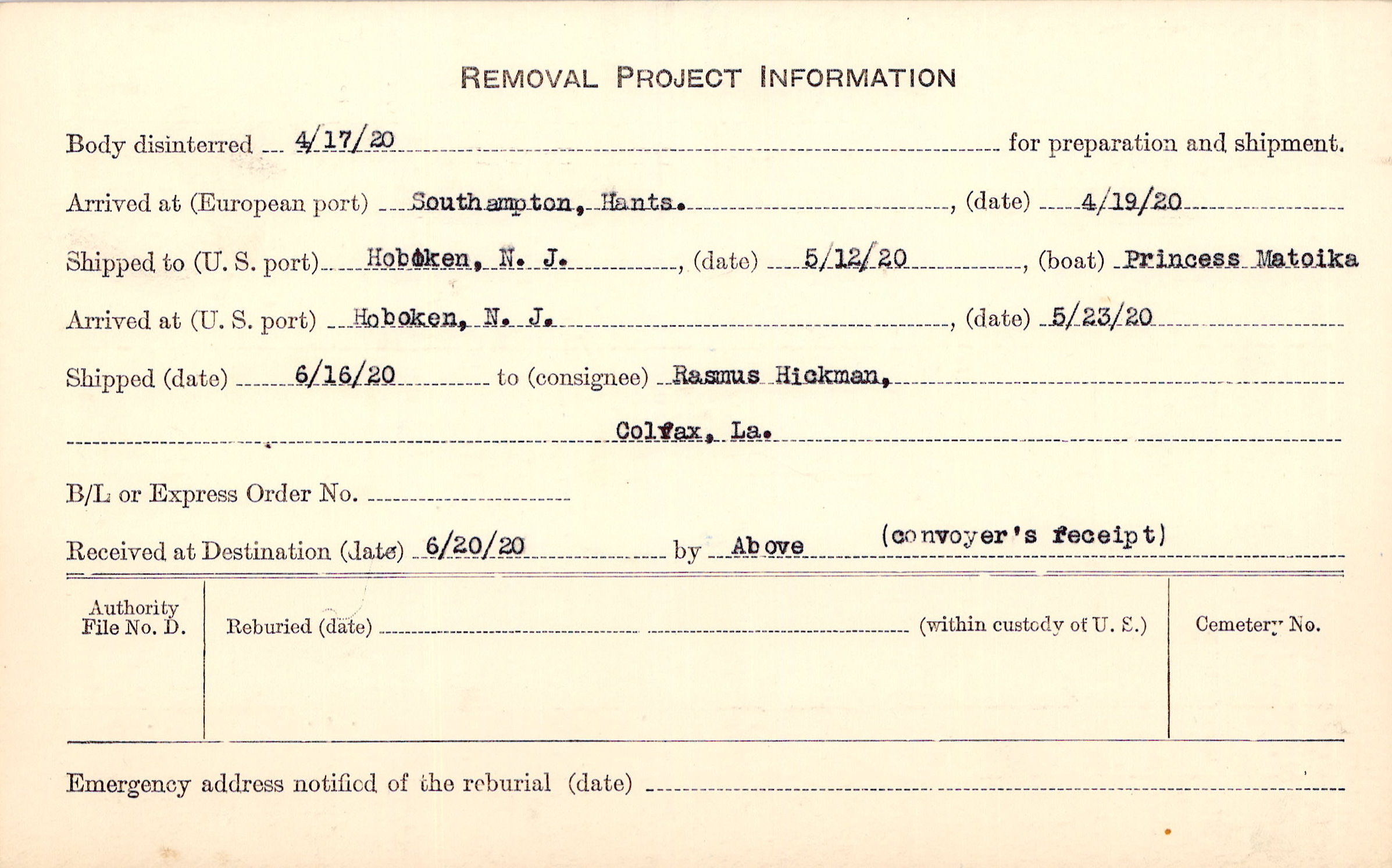 Body disinterred 4/17/1920 for preparation and shipment.
