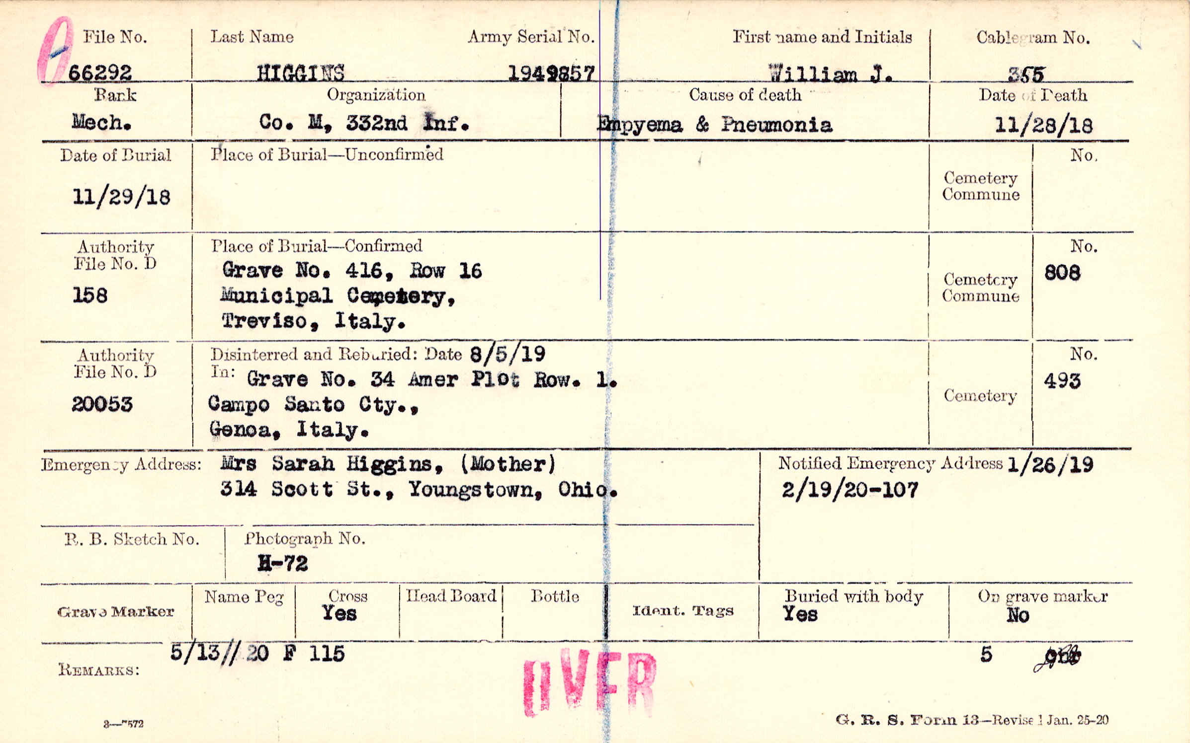 Mrs Sarah Higgins, (Mother), 314 Scott St . , Youngstown, Ohio