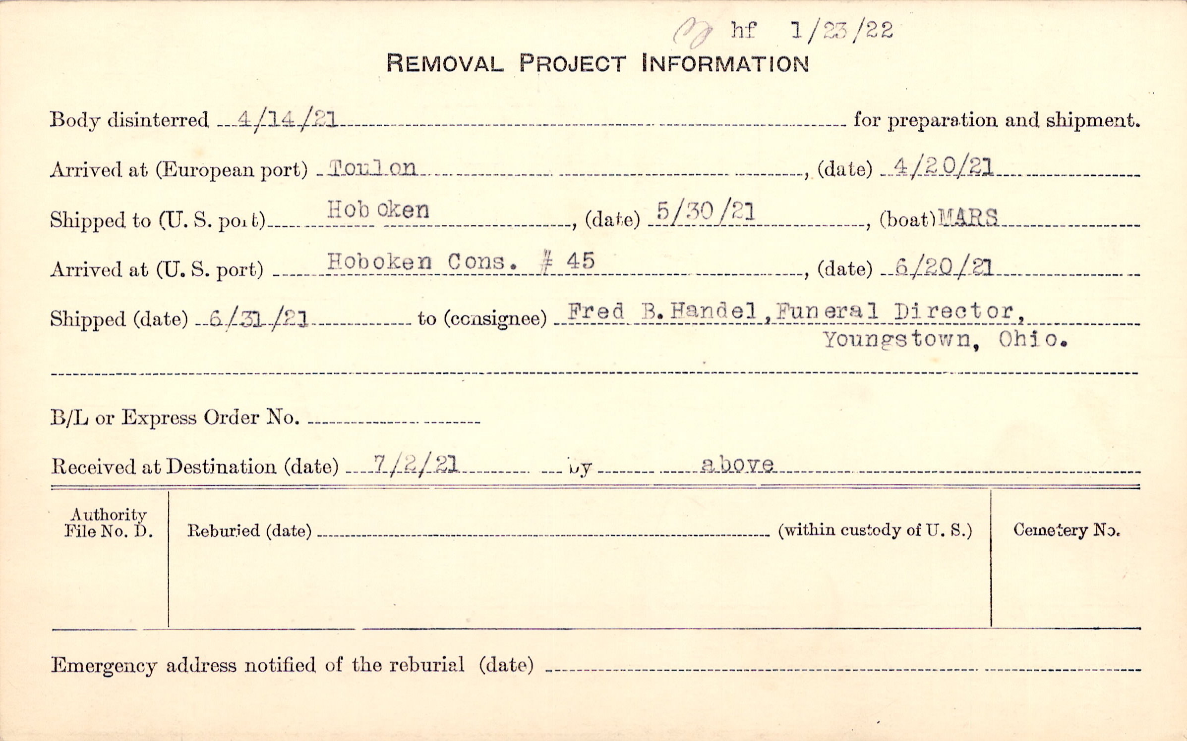 Body disinterred 4/14/1921 for preparation and shipment.