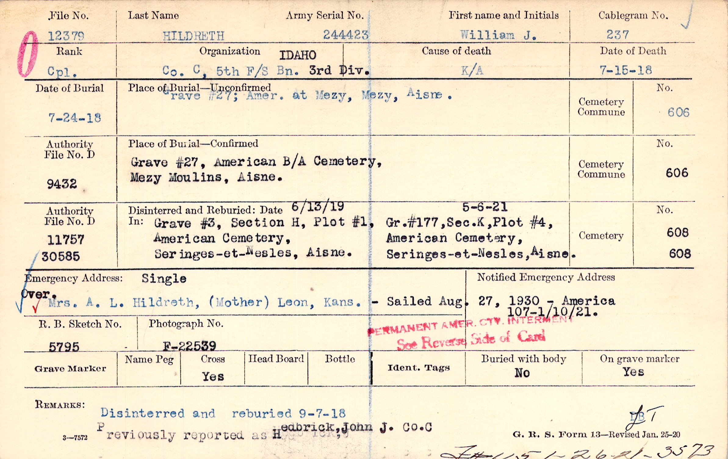 Grave #27, American B/A Cemetery, Mezy Moulins, Aisne.