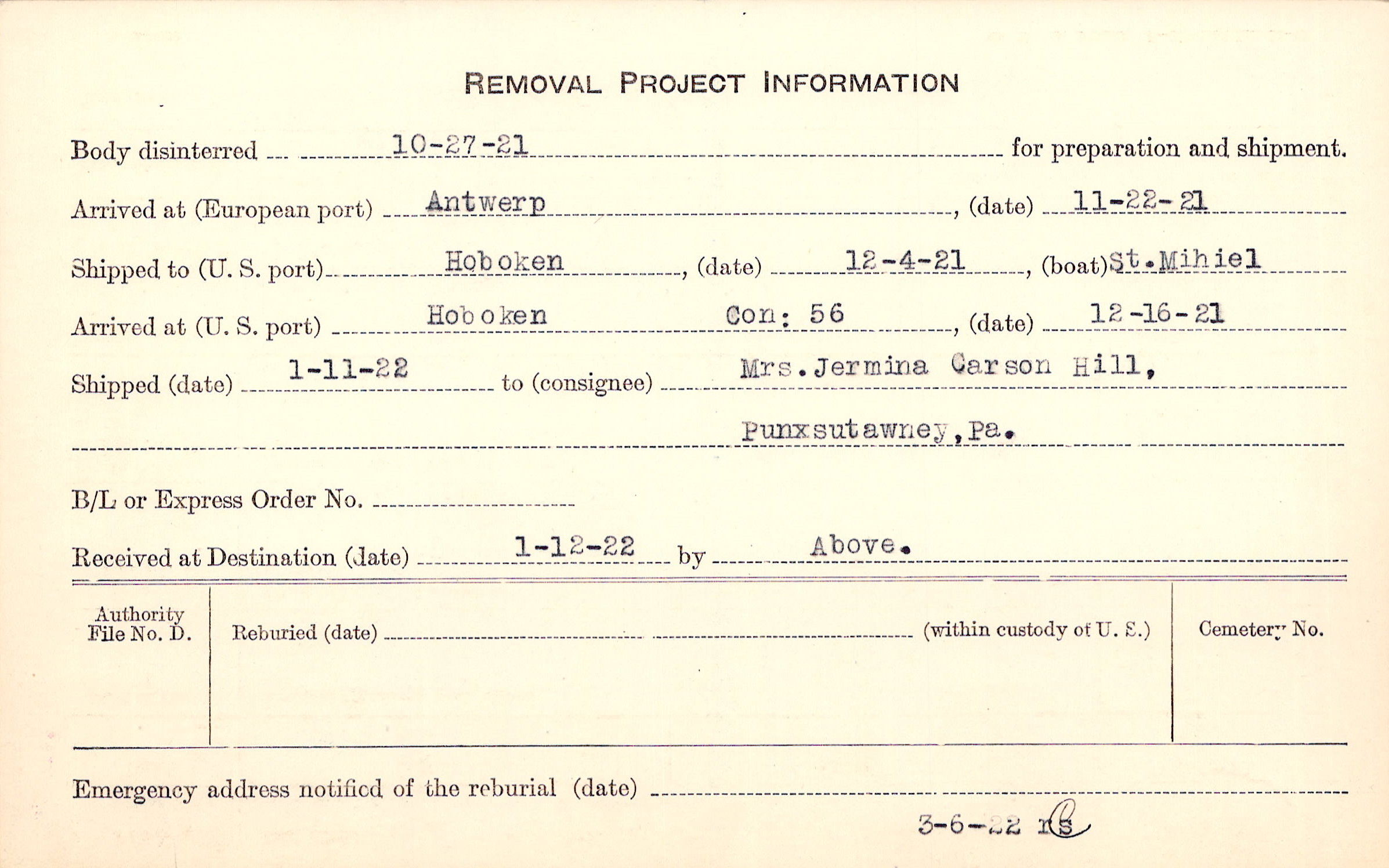 Body disinterred 10/27/1921 for preparation and shipment.