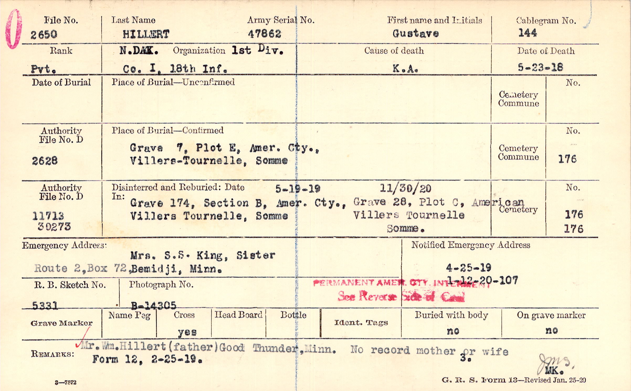 Mr. Wm. Hillert (father) Good Thunder, Miss. No record mother or wife