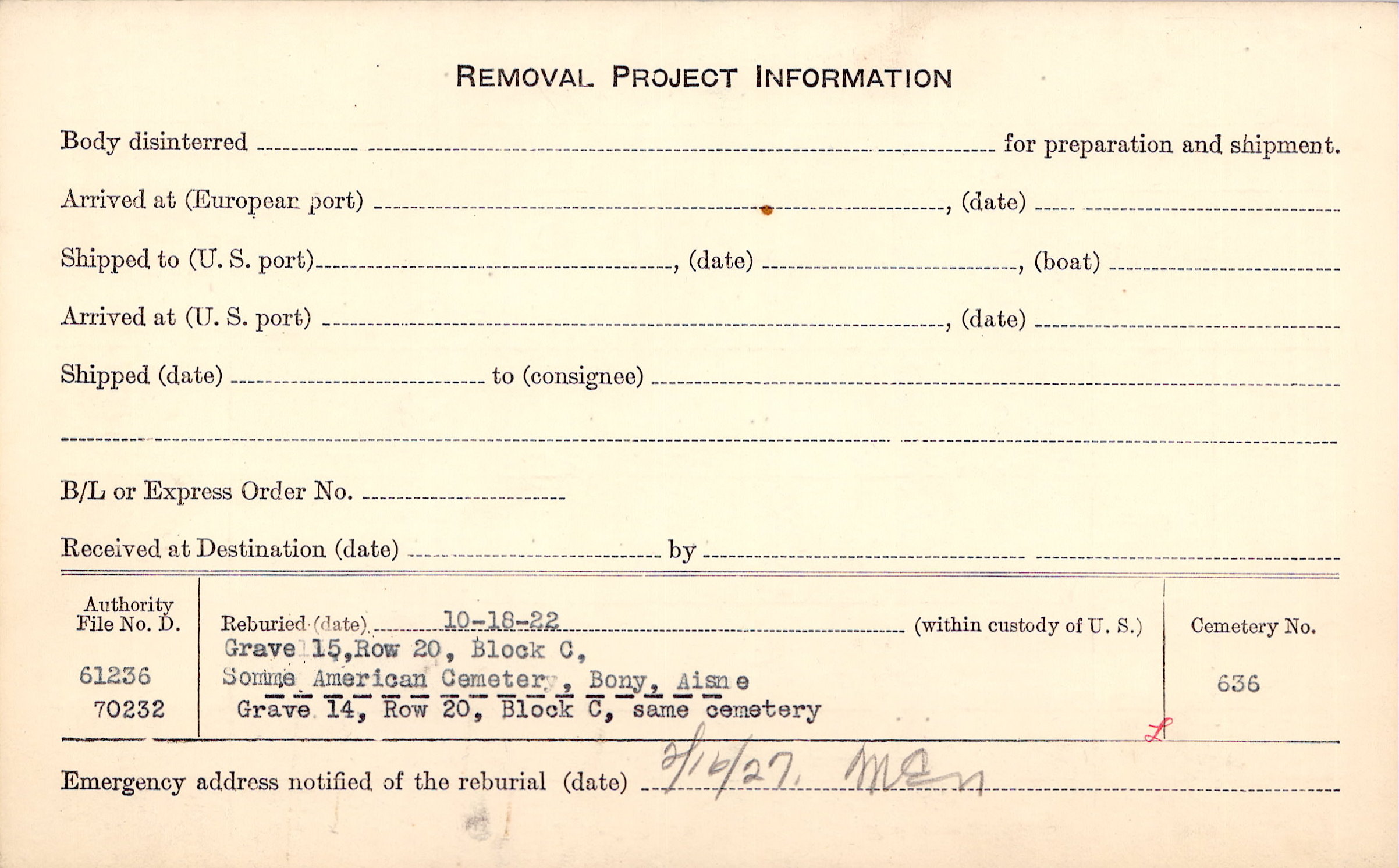 Prior Burial in Foreign Cemetery |