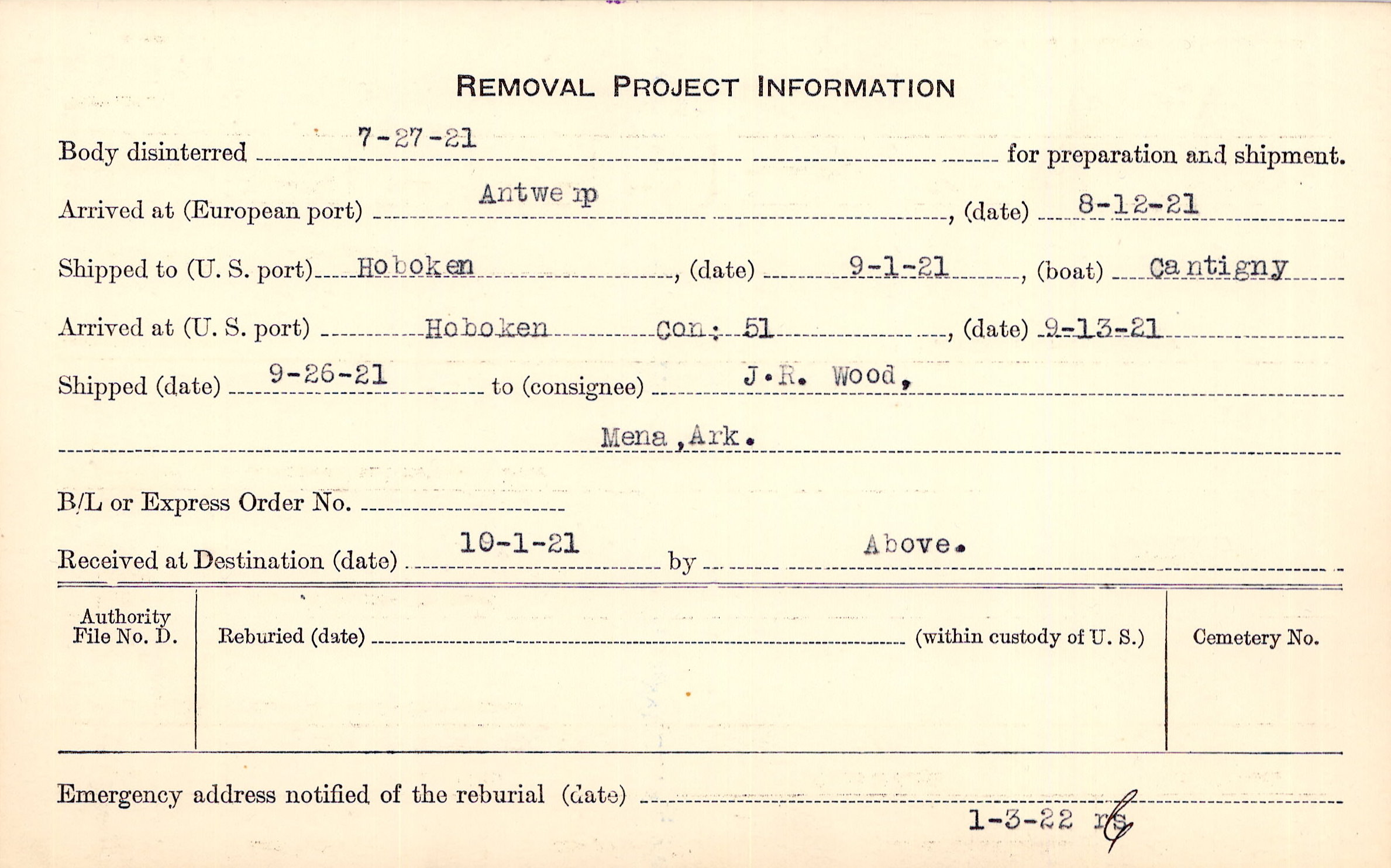 Body disinterred 7/27/1921 for preparation and shipment.