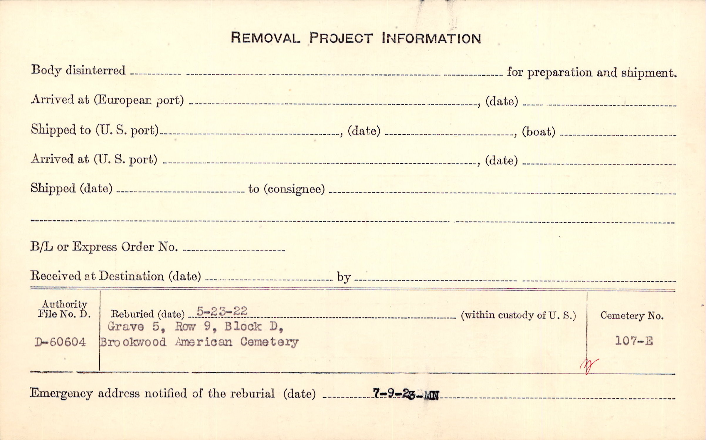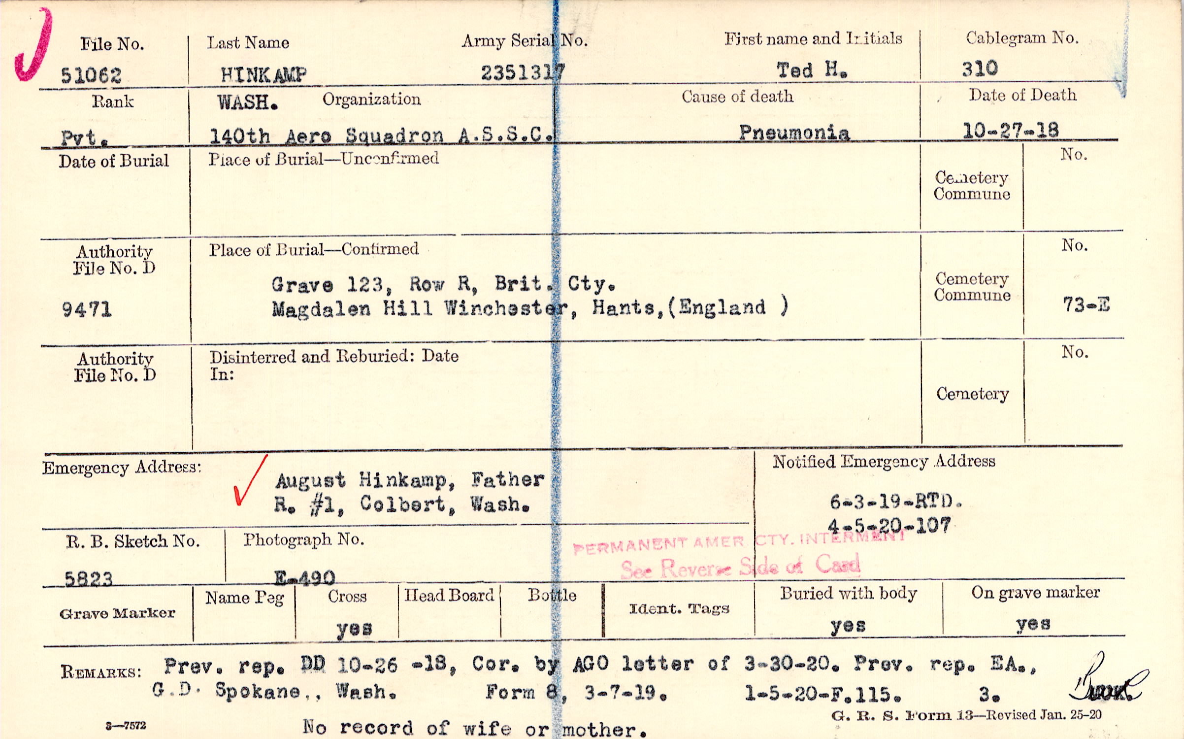 Prev. rep. DD 10-26-18, Cor. by AGO letter of 3-30-20. Prev. rep. EA., G.D. Spokane, Wash. No record of wife or mother., Form 8, 3-7-19., 1-5-20-F.115.