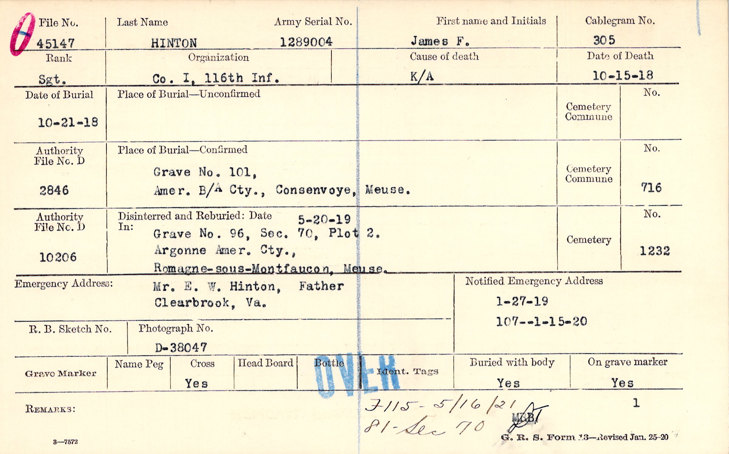 Grave 101, Amer. B/A Cty., Consenvoye, Meuse.