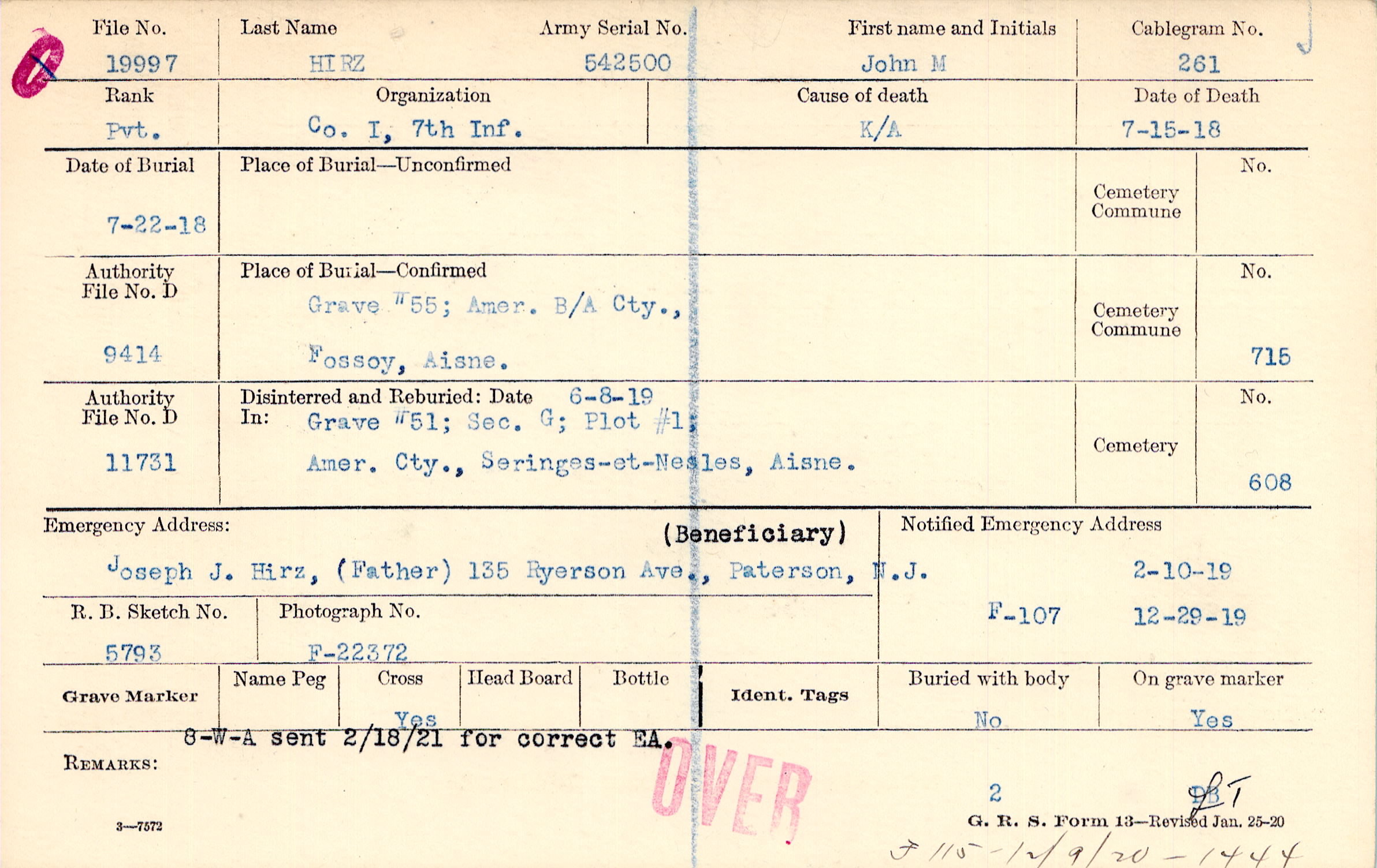Joseph J. Hirz, (Father), 135 Ryerson Ave., Paterson, N.J., (Beneficiary)