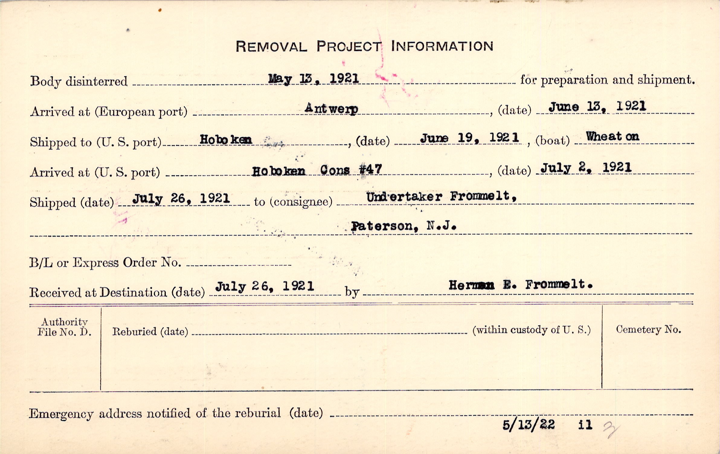 Body disinterred 5/13/1921 for preparation and shipment.