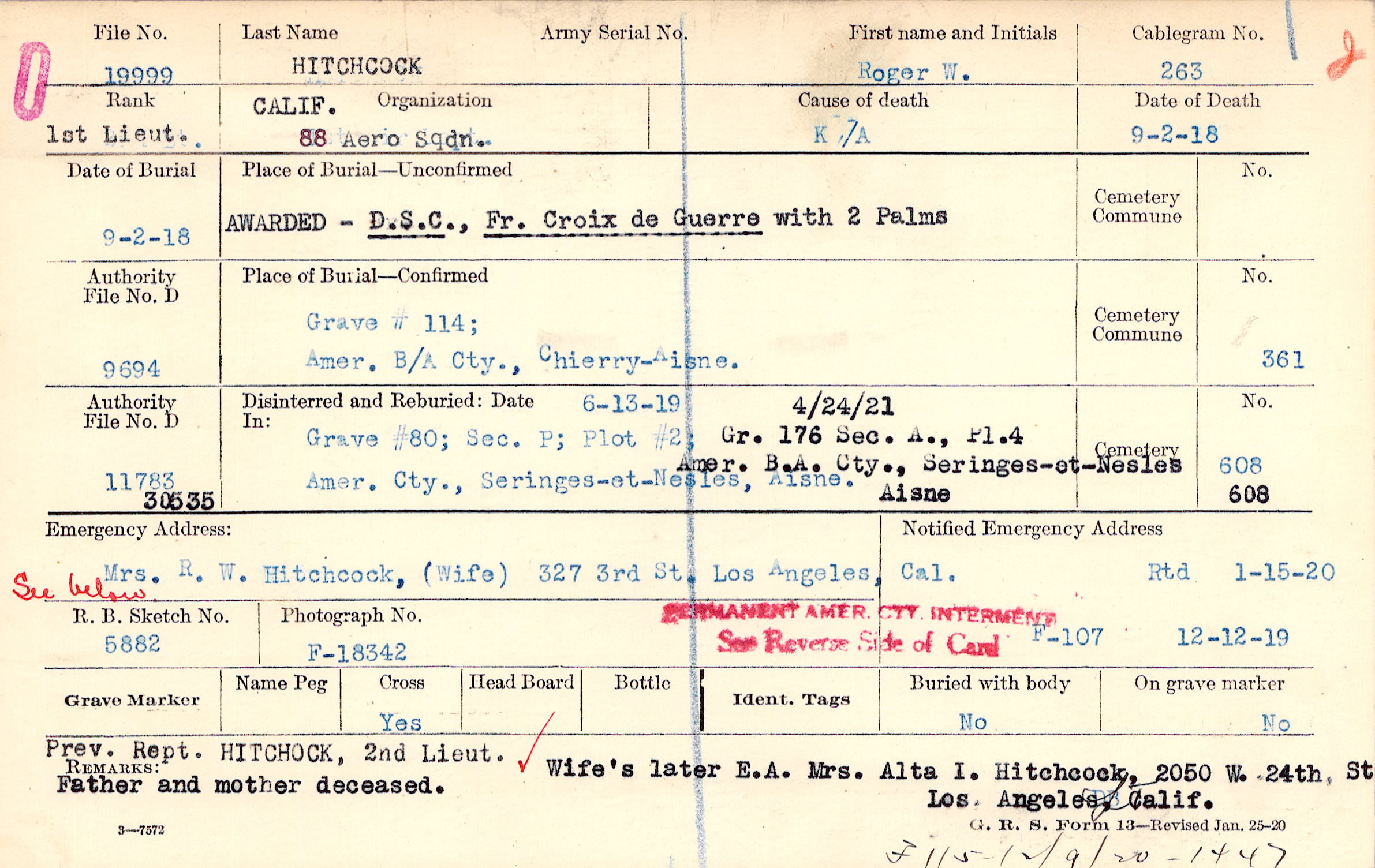 Prev. Rept. HITCHCOCK, 2nd Lieut. Wife's later E.A. Mrs. Alta I. Hitchcock, 2050 W. 24th st Los Angeles, Calif Father and mother deceased., F115-14-1-20 - 1447