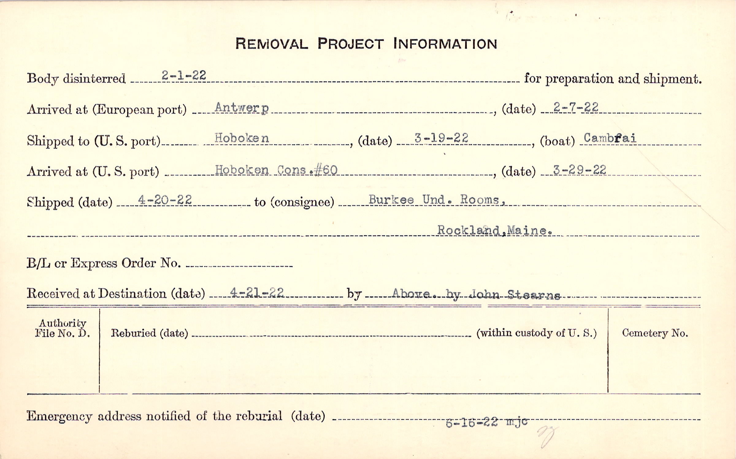 Body disinterred 2/1/1922 for preparation and shipment.